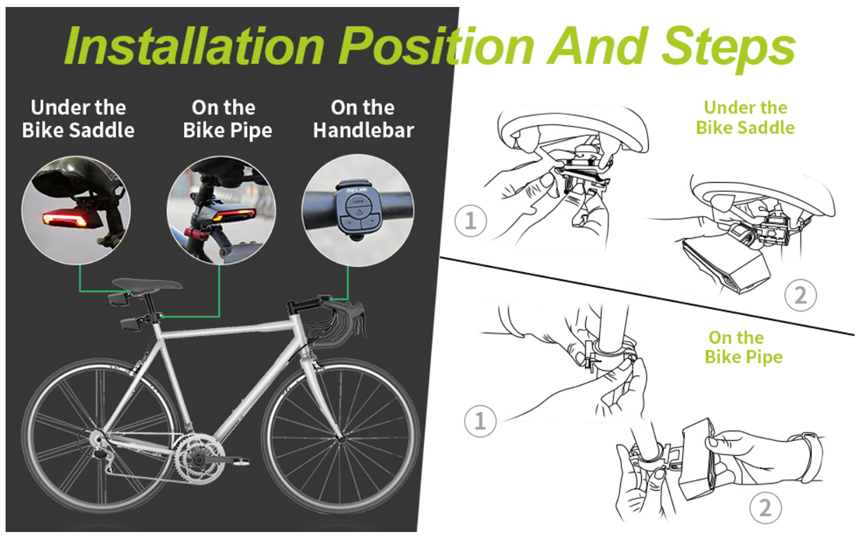 Mounting Type | on the bike pipe / under the bike saddle |