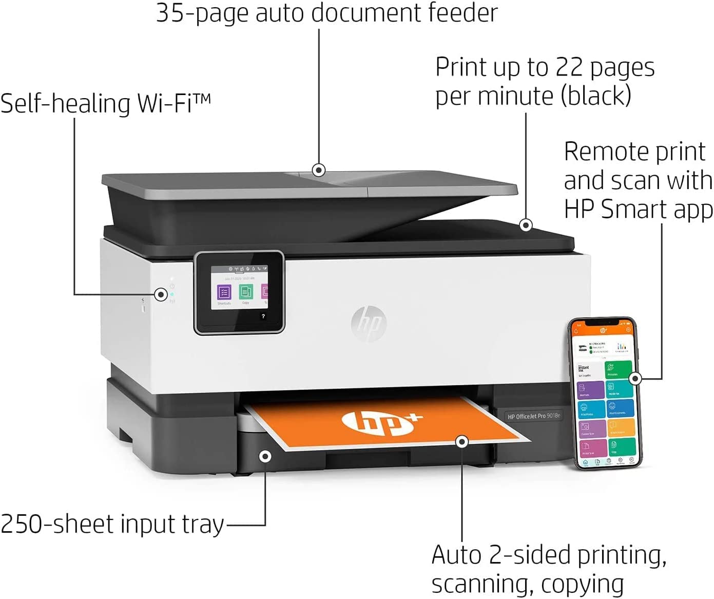 This printer is intended to work only with cartridges that have new or reused HP electronic circuitry, and it uses dynamic security measures to block cartridges using modified or non-HP circuitry. Periodic firmware updates will maintain the effectiveness of these measures and block cartridges that previously worked. Reused HP electronic circuitry enables the use of reused, remanufactured, and refilled cartridges. Get fast print speeds up to 20 ppm, automatic two-sided printing, reliable Wi-Fi connectivity. Activate the HP+ Smart Printing System. Reduce interruptions with self-healing Wi-Fi that keeps you connected. Get security essentials to help maintain privacy and control. Count on chatbot support and helpful notifications with the HP Smart app. Easily share resources – access and print with wireless networking. Introducing HP+. Get more value and HP’s most effortless printing experience all for using Original HP ink. Take control of print, scan, copy, and fax jobs with tap-and-swipe ease, using the color touchscreen. Made from recycled plastics This printer is made from recycled printers and other electronics—more than 15% by weight of plastic.