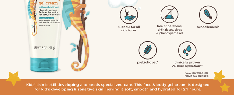 • Enriched with prebiotic oat, this face & body moisturizer is designed for kids' developing and sensitive skin