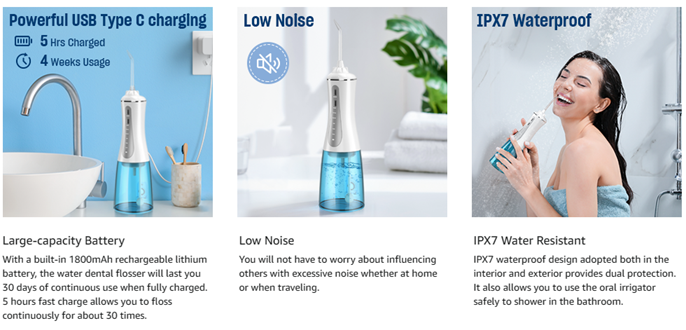 - LARGE 350ML WATER TANK & IPX7 WATERPROOF: With a large 350ml water tank, our water dental flosser provides sufficient water for teeth cleaning without the interruption of adding water repeatedly. The IPX7 waterproof design makes it easy to use the water dental flosser for showering in the bathroom. The detachable design allows easy cleaning of the interior.