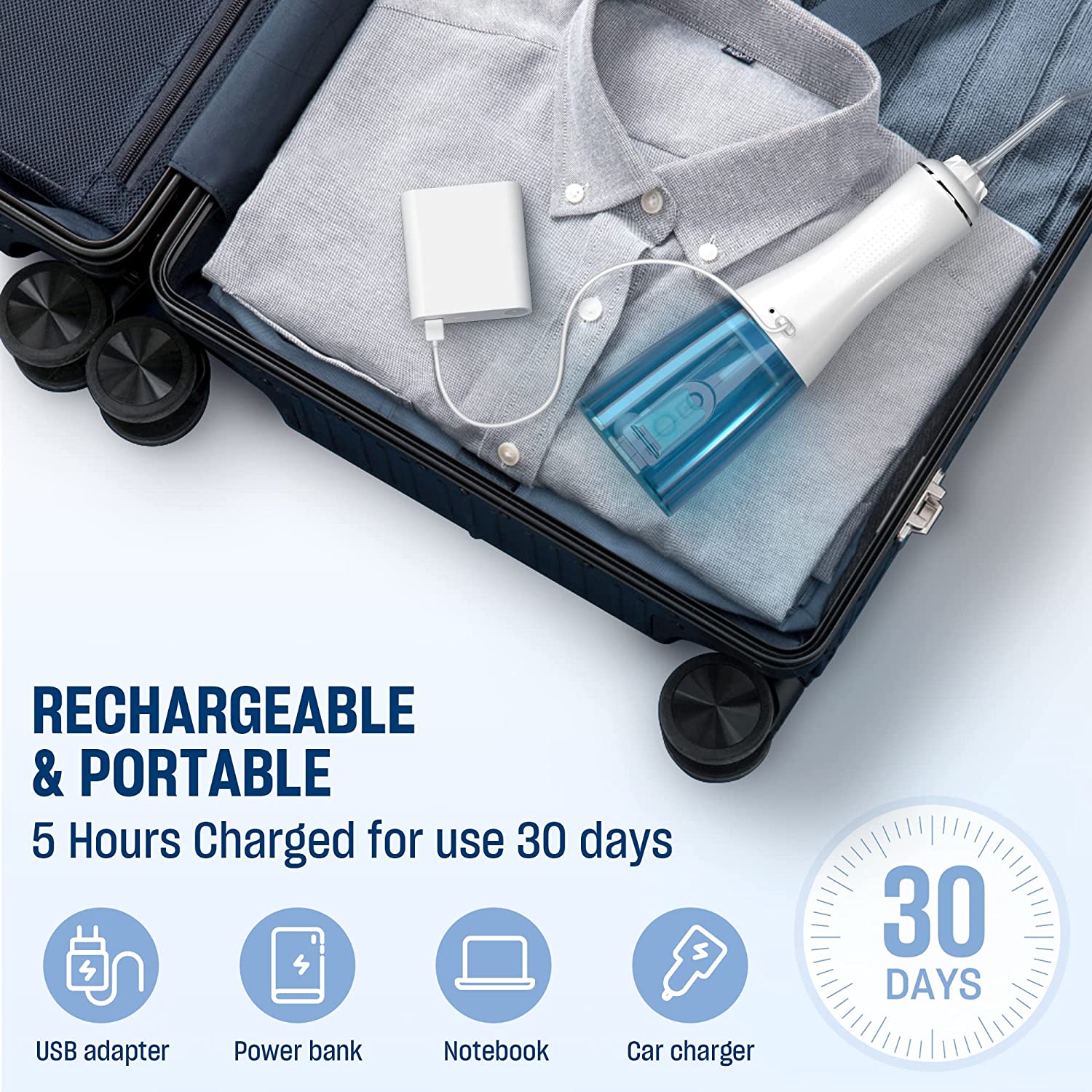 - UP TO 30 DAYS OF USE & PORTABLE DESIGN: The water teeth cleaner can be used continuously for 30 days after 5 hours of full charge. The water cordless flossers can be conveniently charged with USB-enabled devices such as power banks, computers, laptops, and much more. Perfect for travel and home use!