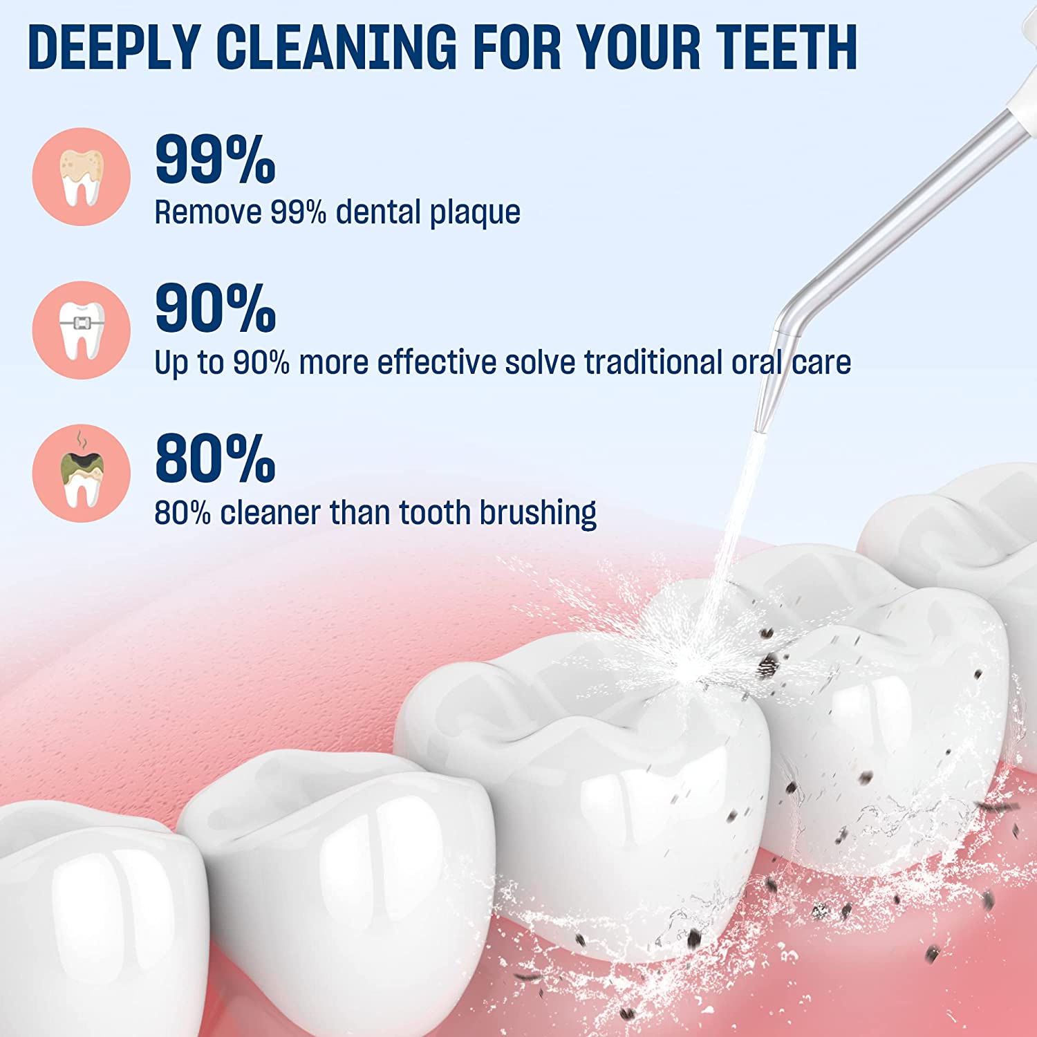 - DEEPLY CLEAN TEETH; IMPROVE GUM HEALTH: Adopting the upgraded Pulse Technique, the water dental flosser offers 2200-3000 per minute pulse frequency and 50-150 PSI water pressure to bring high-power stream delivery. The water teeth cleaner picks can effectively and precisely clean 99.99% of food debris and plaque from every corner.