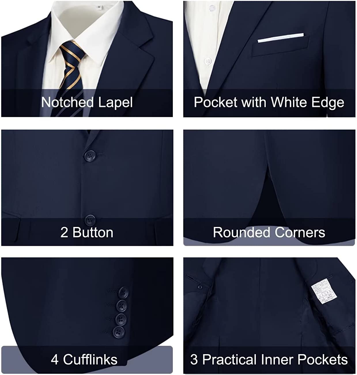 • 【Unique Design】: Suit Blazer: This two button single breasted blazer. Features notched lapels and double side vents. 4 cufflinks on each side. 1 false pocket with white trim. 2 flap practical pockets. 3 practical inside pockets. Suit Pants: Flat-front design. With elasticated waistband. Two slash pockets and two back pockets.