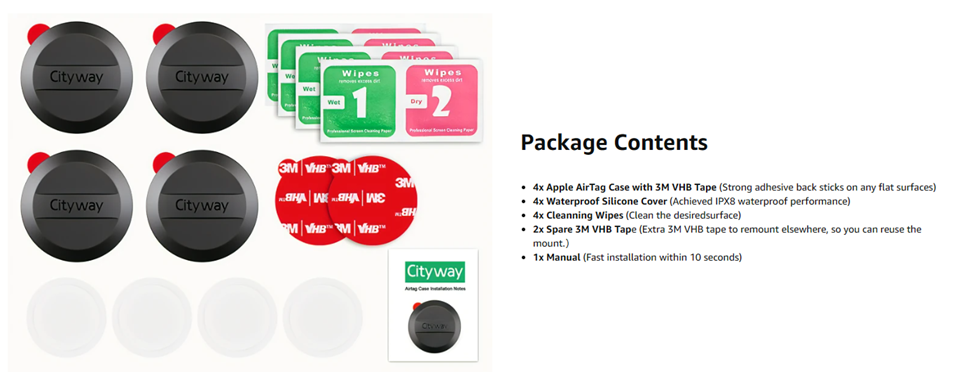 - 【Package Contents】4 Unit of AirTag Case with 3M VHB Tape/ Waterproof Silicone Cover/ Cleanning Wipes and 2 pcs spare 3M VHB Tape, a manual (Not include Airtag). Each case measure about 1.57 x 1.57 x 0.47 inches and weigh 8.2 grams. 1 Year Warranty, we take care of all quality-related issues with a REPLACEMENT or REFUND. If you have any problem, please don't hesitate to contact us and we will solve it for you within 8 hours.