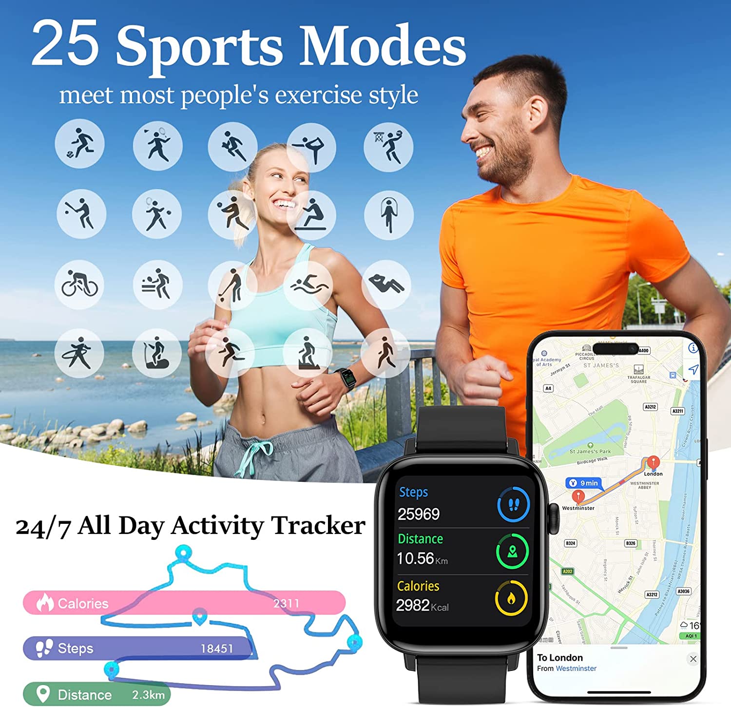 • ⛹️【25 Sports Modes Activity Tracker】The fitness watch meet your various sports styles (walking, running, skipping, cycling, football, yoga, etc). Allow you to get the real-time stats during your workouts on the smart watch. Such as steps, distance and calories burned. You can also connect it to smartphone's GPS to track all your workout routes and distance traveled during exercise.