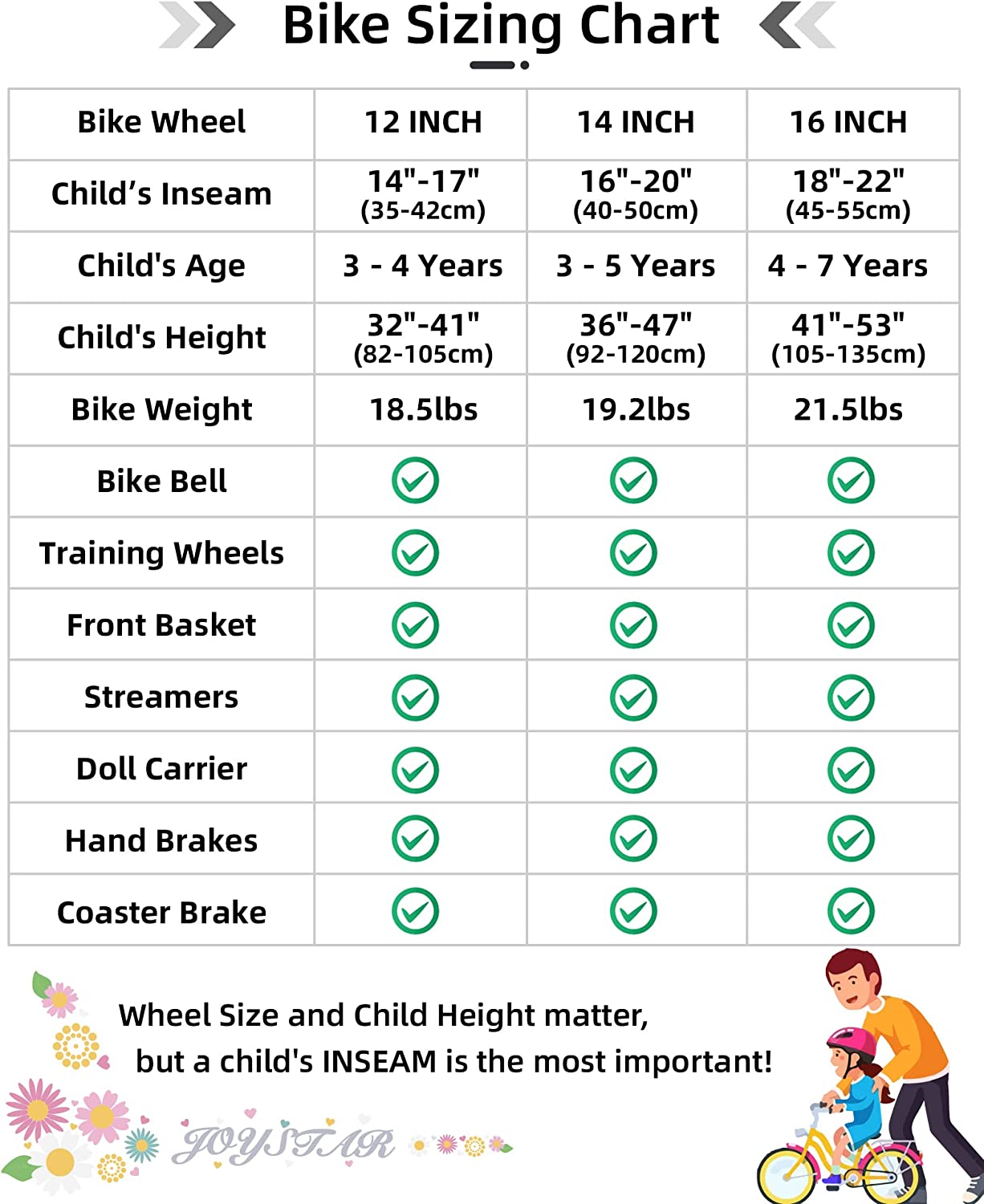 • 5. More Size Options! 12 inch bike is suitable for 2-4 years old (33-41 inch) girls; 14 inch bike is suitable for 3-5 years old (35 - 47 inch) girls; 16 inch bike is suitable for 4-7 years (41-53 inch) girls. Use our easy-to-follow size chart, you'll find a perfect size for your little beloved. Note: Please take the kids height into consideration.
