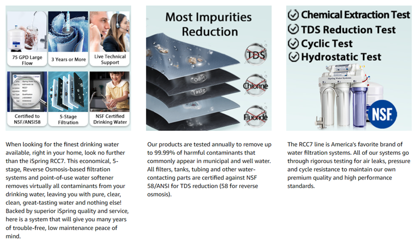 • ISPRING products are designed in the United States and produced in strict accordance with American quality standards. Certified to NSF/ANSI 58, 15 years dedicated to providing unlimited clean, refreshing crisp tasting water superior to bottled water for American families