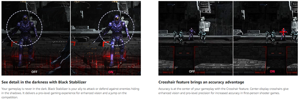 • Dynamic Action Sync helps reduce input lag to help you respond to on-screen action quickly. Black Stabilizer dynamically brightens dark scenes to help you find enemies in the dark. Enhance your accuracy in firefights with the Crosshair feature