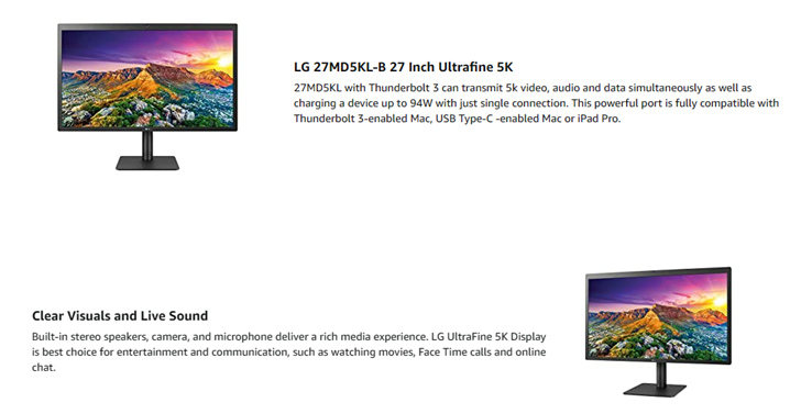The LG UltraFine Display a perfect companion for MAC. The 27 inch Class 5K IPS Monitor with macOS Compatibility. LG UltraFine 5K Display, is over 50% bigger than a 4K display in terms of raw pixel count, with 218 PPI can express exceedingly detailed picture and sharp text. So you can experience more clarity and accuracy on a large 5K screen. Supporting P3 & 500nits of brightness, LG UltraFine 5K Display can express razor-sharp text and life-like images with wide color gamut and range of colors. 27MD5KL with Thunderbolt 3 can transmit 5k video, audio and data simultaneously as well as charging a device up to 94W with just single connection. This powerful port is fully compatible with Thunderbolt 3-enabled Mac, USB Type-C -enabled Mac or iPad Pro.