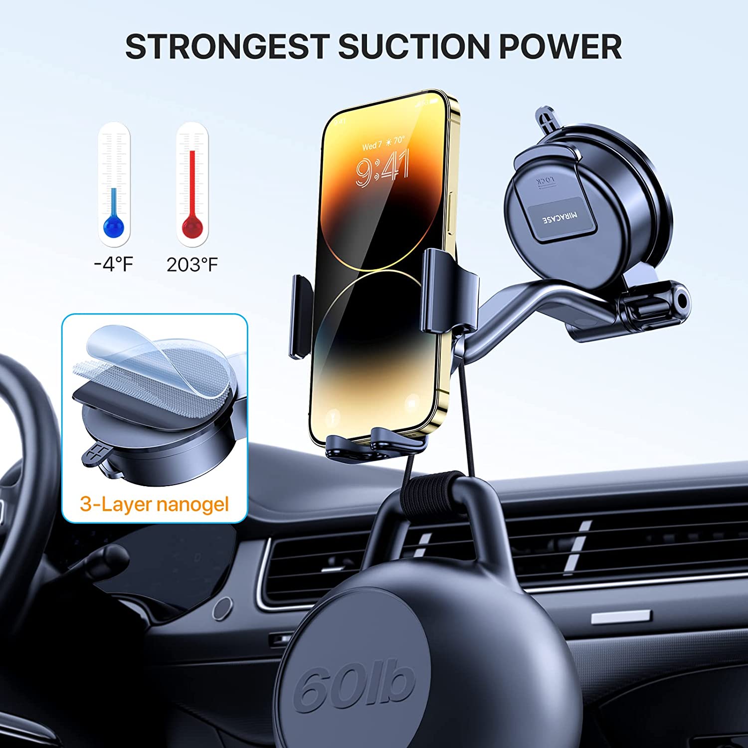 • ?[STRONG SUCTION CUP & SUPER STABLE] Miracase car cell phone holder uses third-generation suction cup, upgraded 3 layers nano-gel, can bears weight up to 60 lbs force! Powerful suction keep your cell phone stay stably even when drive on a bumpy road. The suction cup can withstand the temperature from -20℃/(-4°F) to 95℃/(203°F), works well for Heatwave in California perfectly. (Note: The suction cup are reusable; If the surface of suction cup are dirty, wash it and let it air dry.)