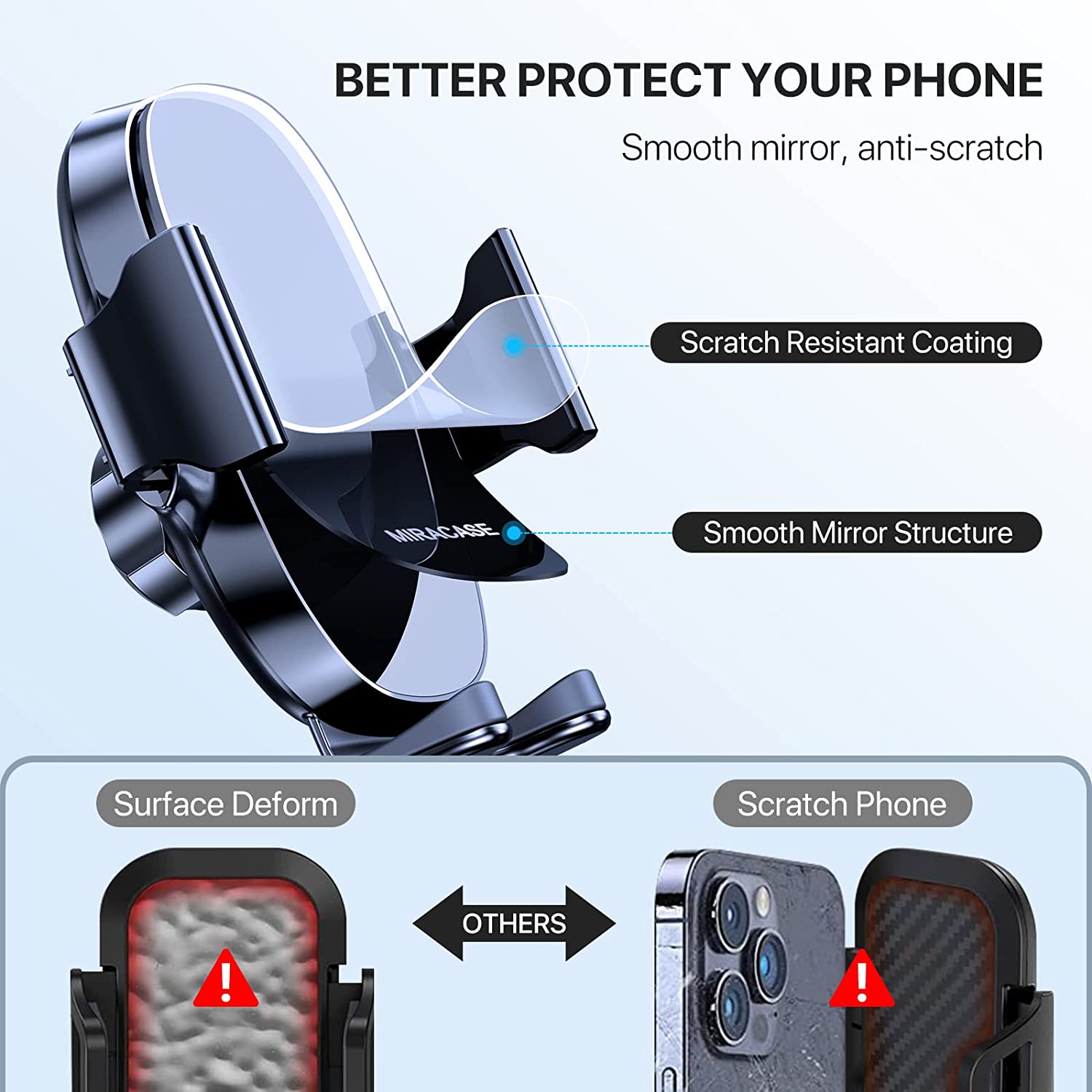 • ?[UNIQUE AND COMPREHENSIVE PROTECTION] Over 12-Year technology precipitation, Miracase were the first to introduce the most beautiful and functional car phone mount. The clamps adopt smooth mirror structure, elegant surface is far superior to other types of car mount and the scratch resistant coating avoid phone being scratched. Sponge on the 2-side clamps & thicken rubber holding feet provide strong support for phone, don't worry your phone fall off while driving.