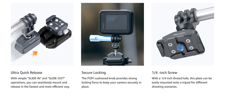 - Ultra Quick Release - F22&F38 quick release kit for action camera, cleverly blend the ancient Chinese mortise and tenon with modern mechanical structure. A push to install, a press to remove, incredibly fast. With simple "SLIDE-IN" and "SLIDE-OUT" operations, you can seamlessly mount and release in the fastest and most efficient way.