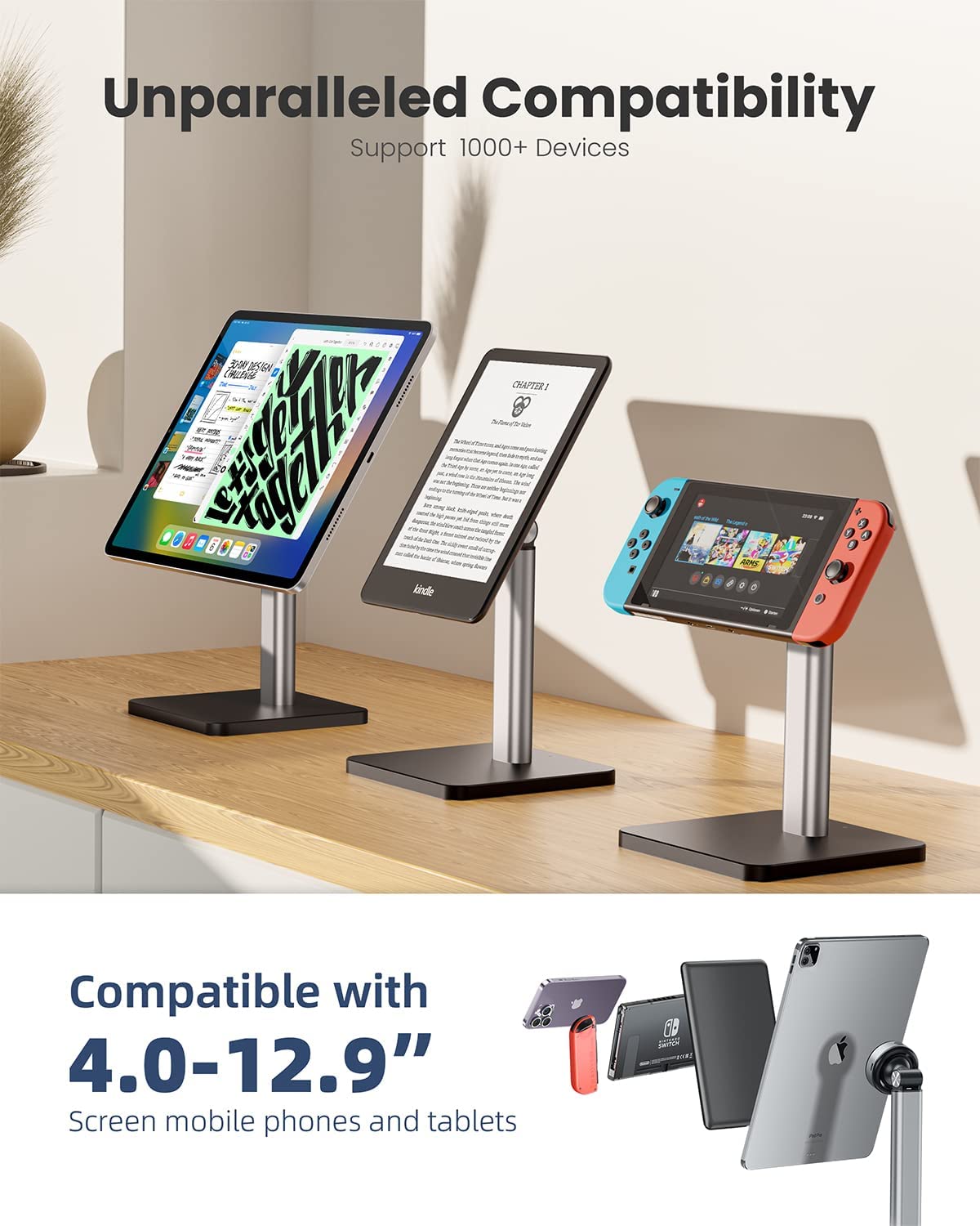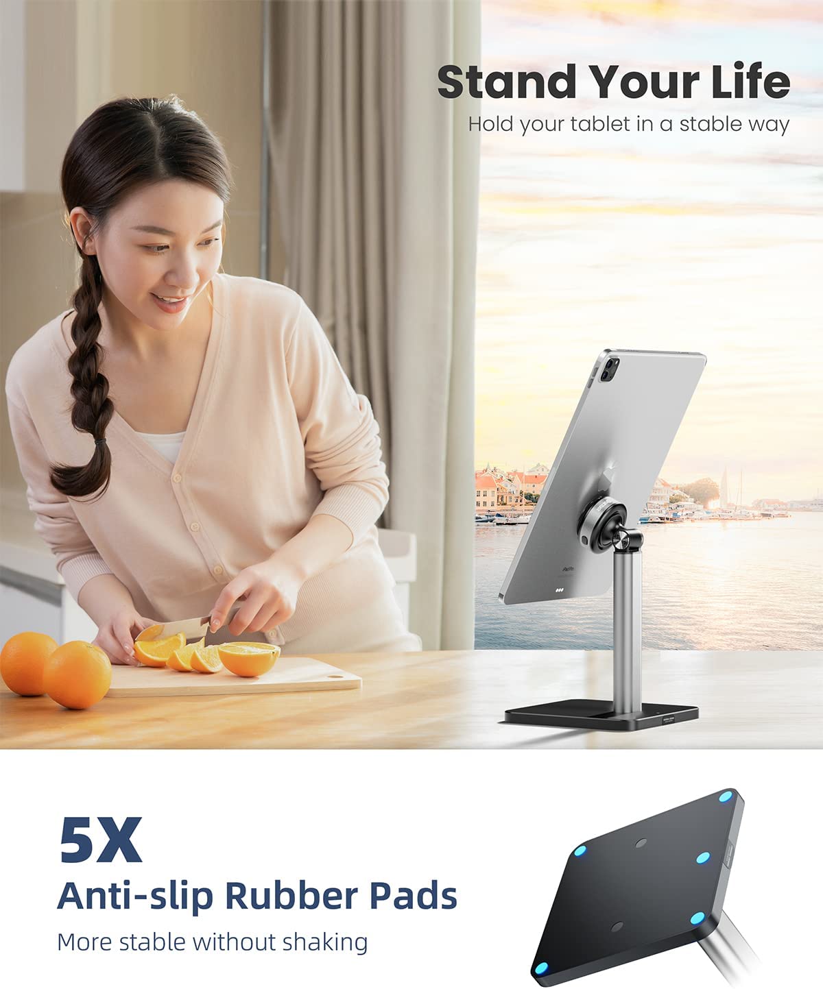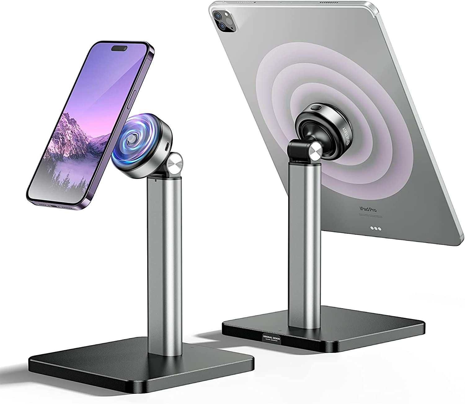 • [Adjustable Angle & Weighted Anti-Slip Base]: Ergonomic ipad stand, when using the mobile phone stand, it can adjust the elevation angle of 135° and rotate 360° to provide you with the best visual experience. in the meantime, the cell phone stand boasts a reinforced base and anti-slip silicone pad at the bottom to hold your devices steadily.