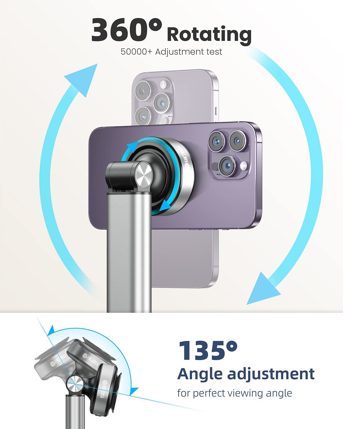 • [Vacuum Adsorption]: Say goodbye to the cumbersome installation process of traditional mobile phone stand. This innovative design phone holder uses vacuum adsorption, put the electronic device parallel to the vacuum suction cup head, and push it firmly against the suction cup, it can be firmly fixed. The maximum suction power can reach up to 11LB(5Kg).