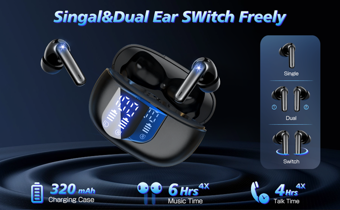 - Quadruple Use Time - 4 hours of talk time and 6 hours of music time in earbuds. An additional 4 times battery life is provided for earbuds through the 320mAh charging case. Therefore, up to 48 hours of use time in a single headset rotating.