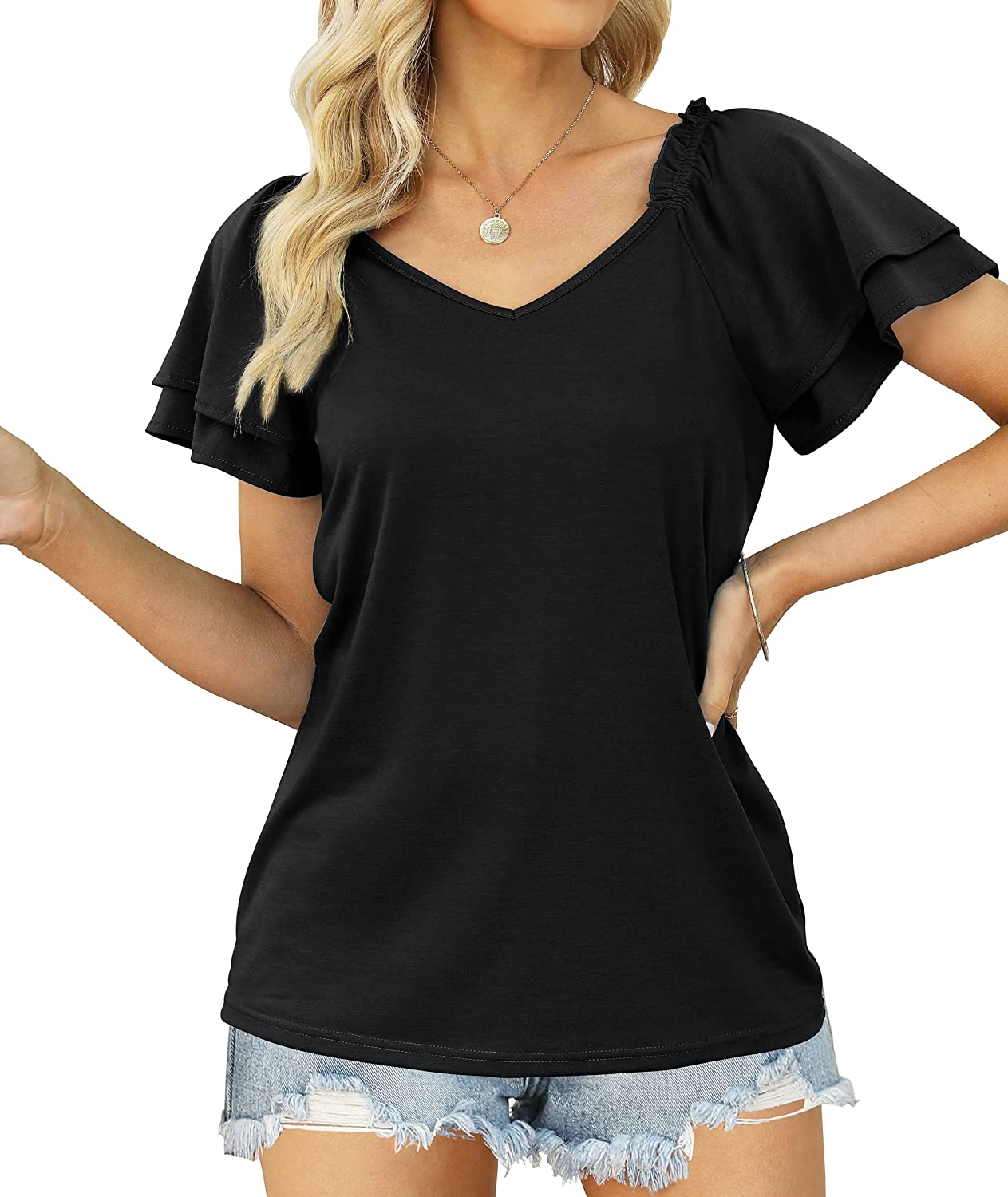 SAMPEEL Womens Summer Tops Ruffle Short Sleeve V Neck T-Shirts Cute Blouse Shirts