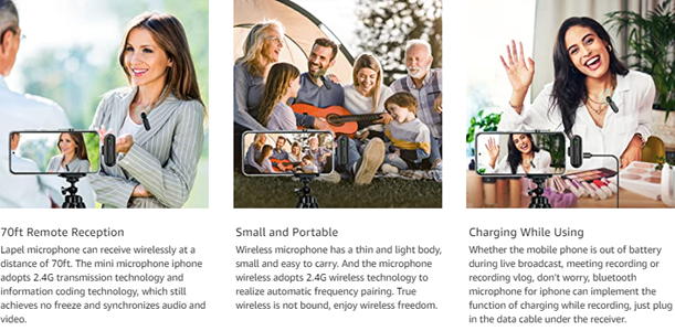 Iphone microphone just can help you solve this problem. Iphone microphone for video recording does not require cumbersome operations, low latency, plug and play and easy to use. Lapel microphone wireless adopts 2.4G wireless technology, real-time ear monitor, 360° surround pickup, double noise reduction! Let you use it comfortably and rest assured.