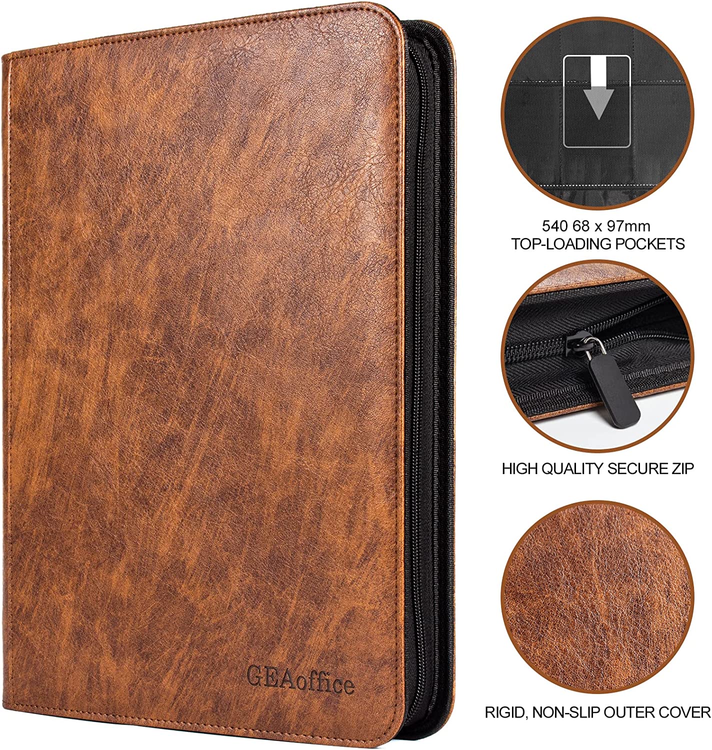 LARGE STORAGE CAPACITY - 9 pocket per page premium quality zip-up trading card binder. With padded, extra rigid front and rear covers made from non-slip, water-resistant PU leather material. 30 pages hold 540 cards. Made from archival-safe, acid-free non-PVC material.