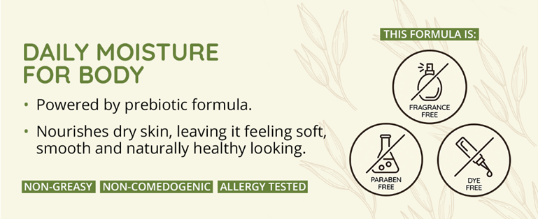 Aveeno Daily Moisturizing Body Lotion with Prebiotic Oat formula intensely nourishes dry skin. Formulated with a soothing prebiotic oat, the fragrance-free lotion has clinically proven moisturization that lasts 24 hours. This daily body lotion nourishes and helps replenish skin's natural moisture barrier. The unique prebiotic oat formula absorbs quickly and nourishes dry skin with moisture, leaving your skin soft, beautiful and healthy-looking. Aveeno Daily Moisturizing Lotion's gentle formula does not contain fragrances, parabens, or dyes. From the dermatologist-recommended brand, this nourishing lotion for dry skin has been allergy tested and non-greasy, non-comedogenic, and gentle enough for daily use as part of a regular skincare and beauty routine. To use, apply daily as often as needed.