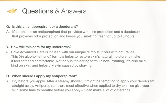 Have you been wondering how to get soft and comfortable underarms? Try Dove Advanced Care Caring Coconut Antiperspirant Deodorant Stick. This pampering antiperspirant stick infused with a creamy coconut scent leaves your underarms feeling healthy and protected. Our alcohol-free formula, enriched with our signature 1/4 moisturizers with natural oil, is kind on delicate underarm skin and helps it recover from the irritation that regular shaving can cause. After a few uses, you’ll notice that your underarm skin feels soft and comfortable. As much as it cares for your skin, this Dove deodorant for sensitive skin doesn’t compromise on antiperspirant protection. It will keep you dry and fresh all day with up to 48 hours of protection against sweat and odor. For best results, apply this Dove antiperspirant deodorant to dry skin after showering and enjoy fresh, comfortably dry skin from morning to night. Dove is certified cruelty-free by PETA because we believe that real beauty is cruelty-free. We’re on a mission to help women raise their self-esteem – because we believe beauty should be a source of confidence, not anxiety. Dove Antiperspirant Deodorants deliver effective underarm protection and are kind to skin, so women can be free of underarm inhibitions and live beautifully unselfconsciously.