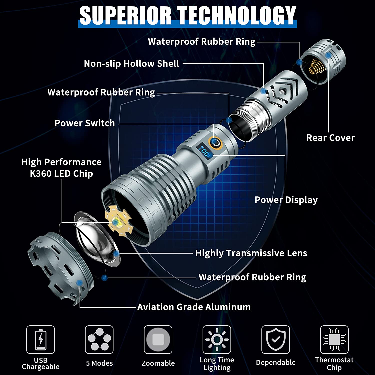 Zavuxo Flashlights High Lumens Rechargeable LED Flashlight, Super Bright Tactical Flashlights 180000 Lumens Handheld Flashlights with 5 Modes, Zoomable, Waterproof Flashlights for Emergencies Camping
