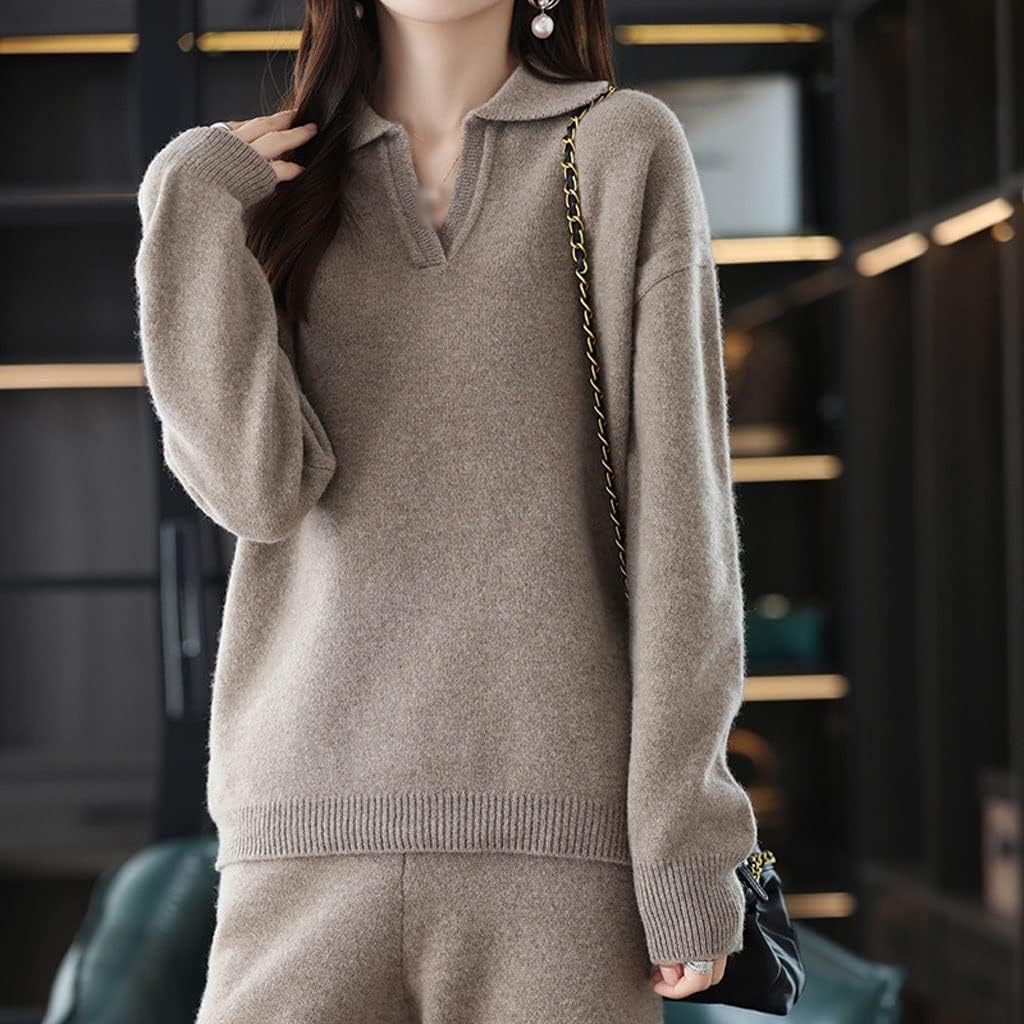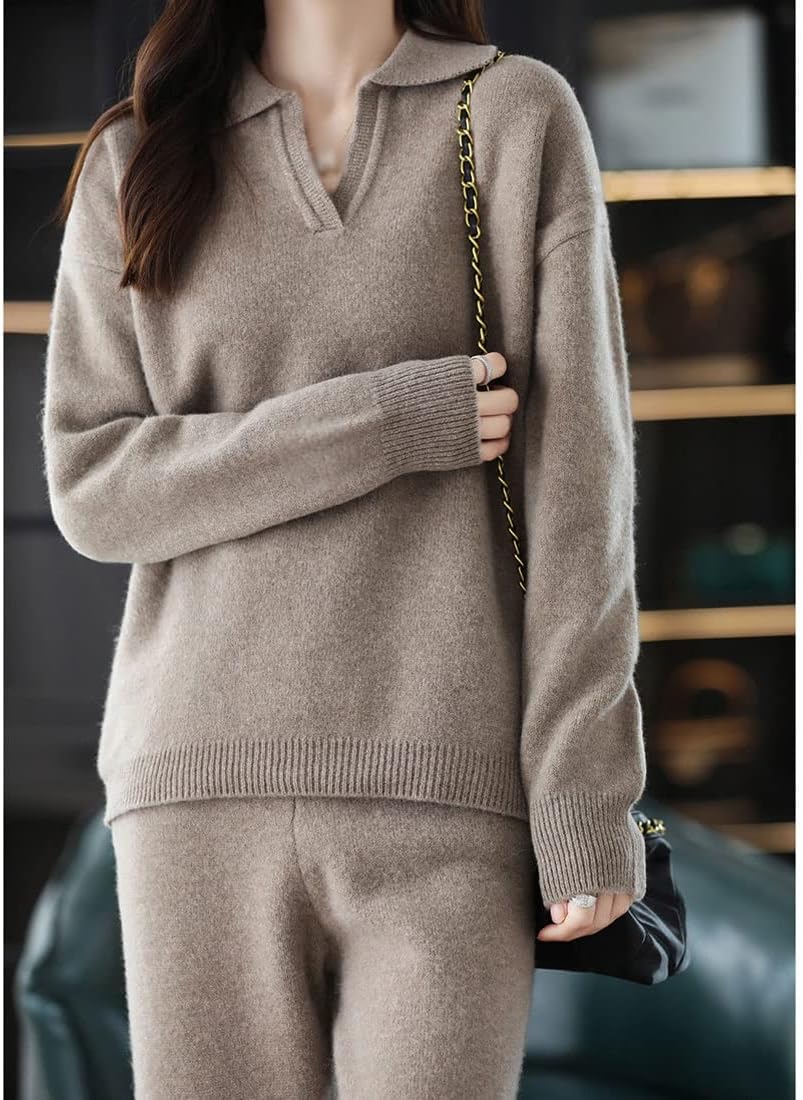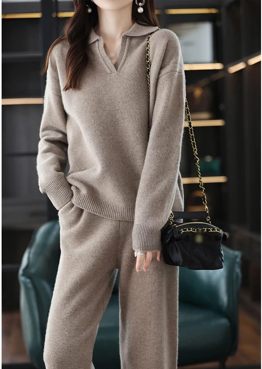 Walnut Two Pieces Cashmere Wool Suits Female Turtleneck Warm Knit Tops and Casual Pants Sets (Color : Gray, Size : 1)