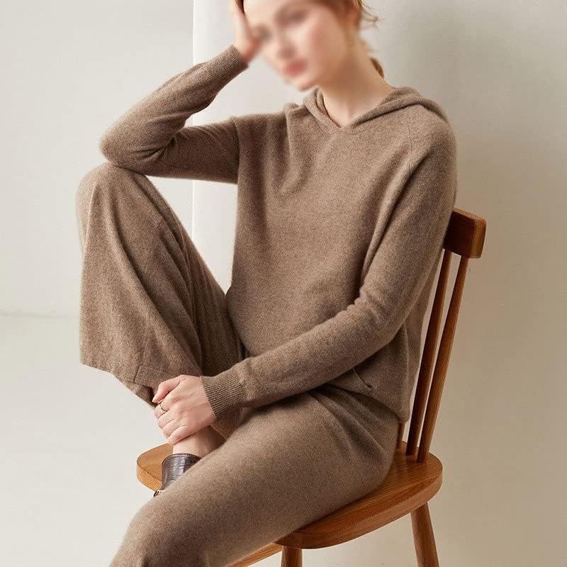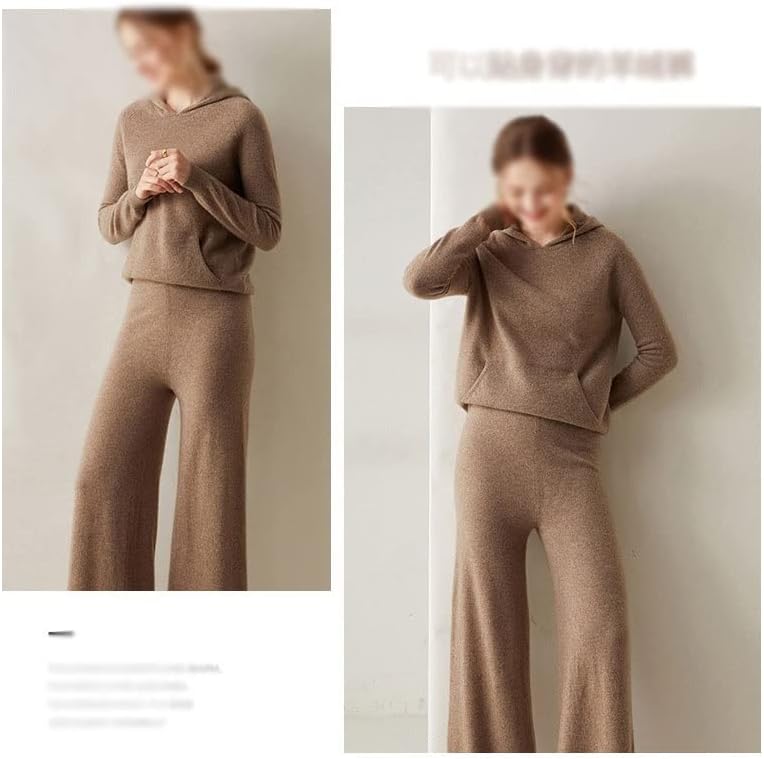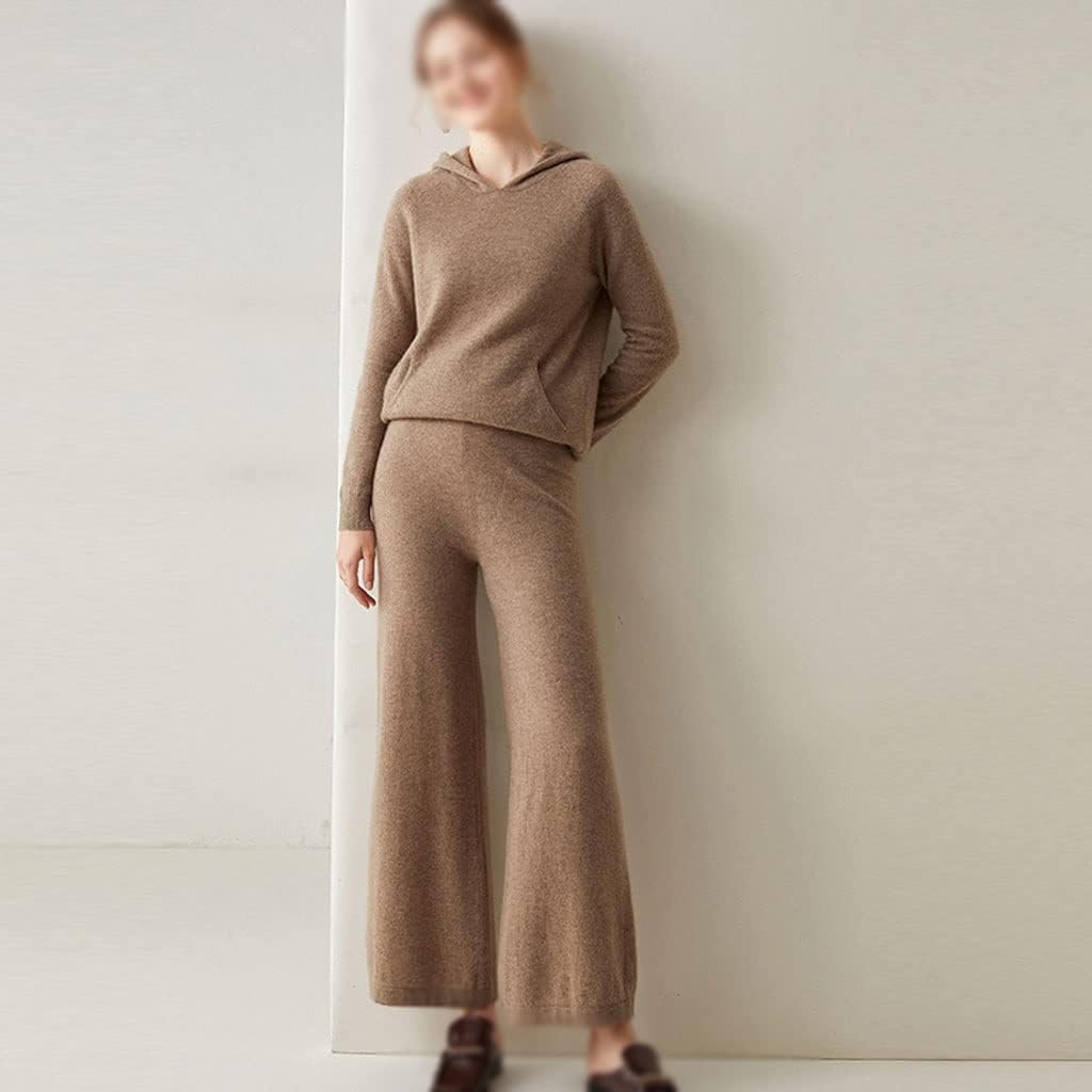 Walnut Two Pieces Cashmere Wool Suits Female Hooded Knit Sweater Set Warm Cashmere Knit Tops and Wide Leg Pant Sets (Color : D, Size : L Code)