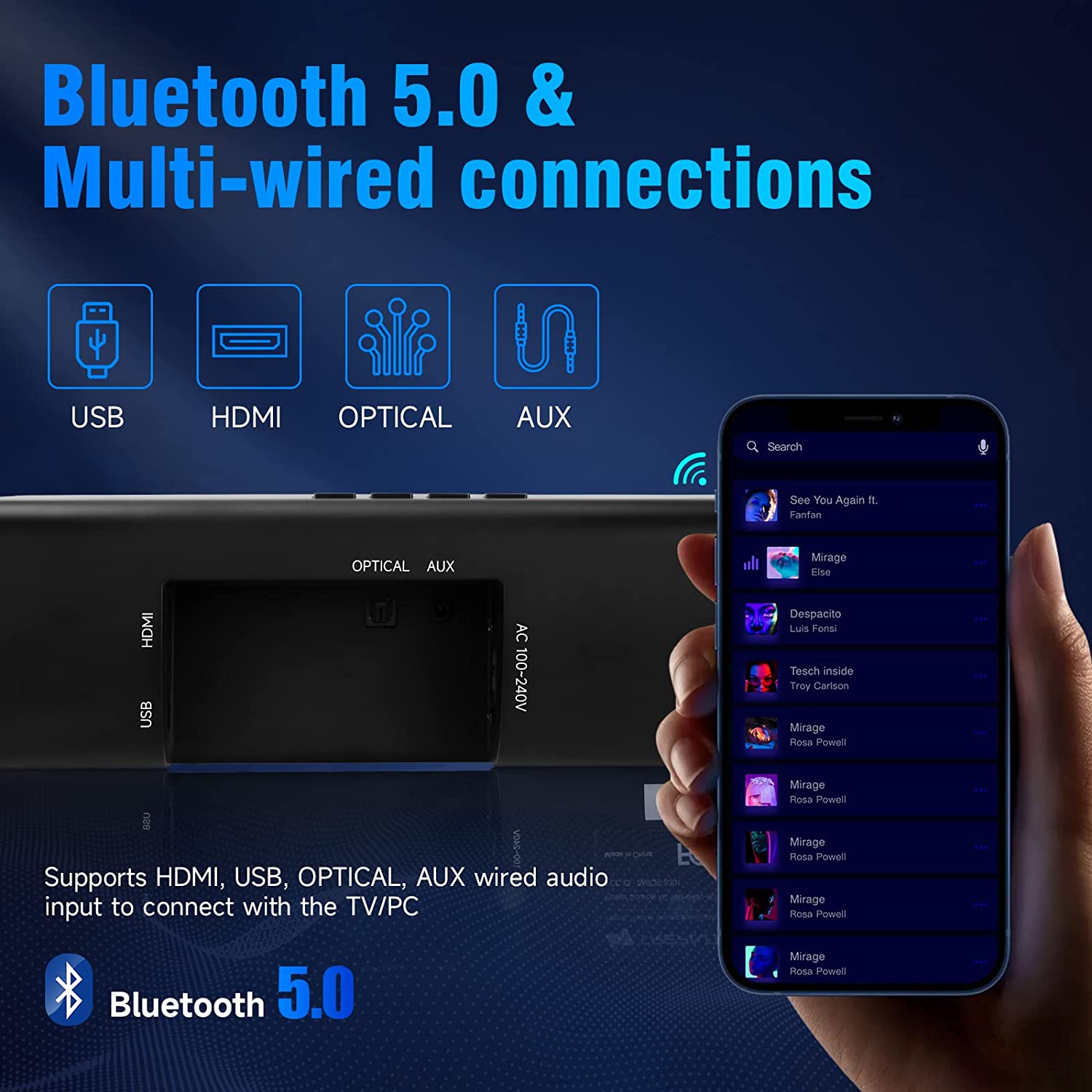 • 【Universal Connections】:Soundbar is compatible with HDMI/Optical/AUX/DC/USB connectors, which can be connected to large majorities of devices, such as TV/PC/smart phone/Projector/U Disk/iPad/Gaming console. It’s not only a TV sound bar with subwoofer, also a soundbar for PC and sound bar for projector.