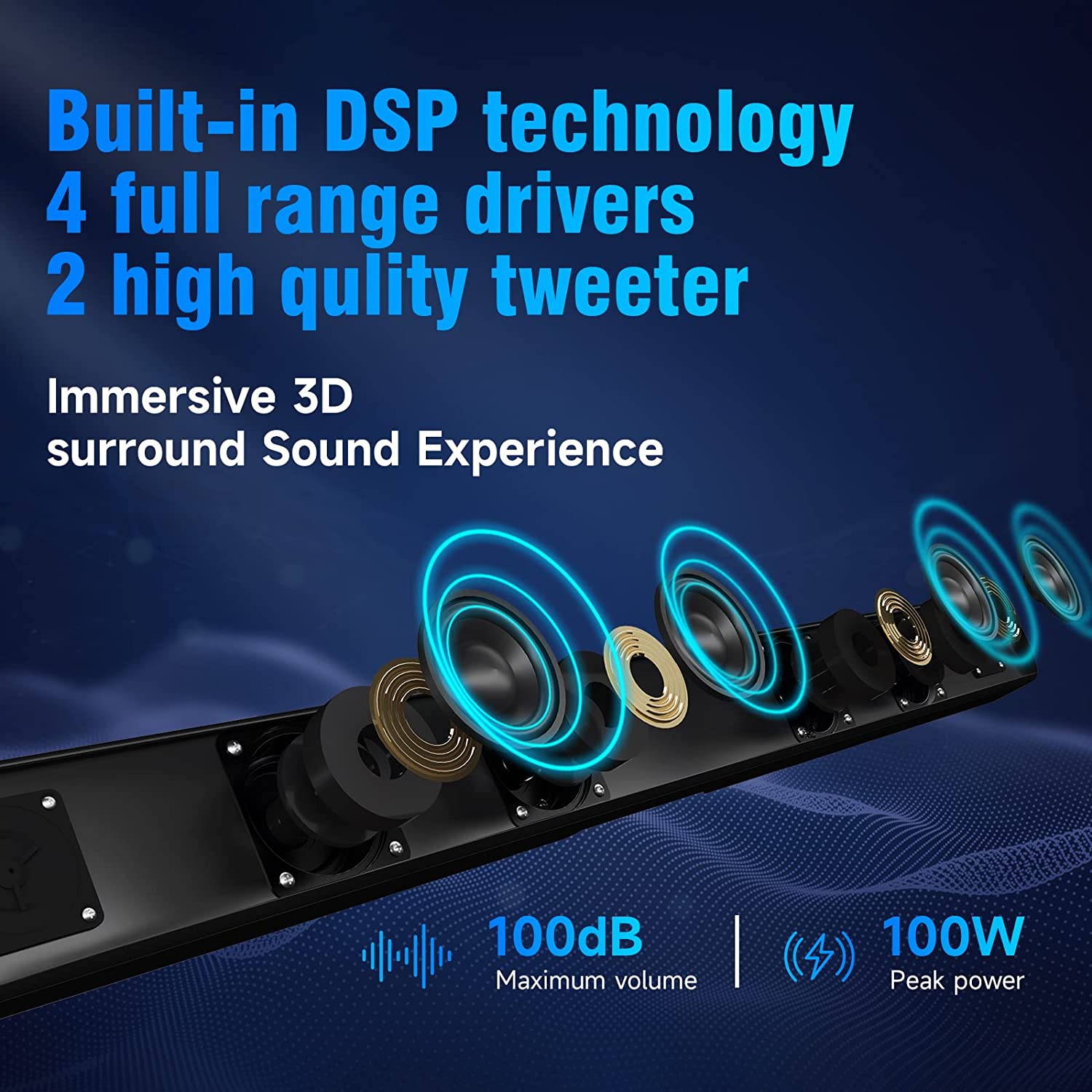TREFAN Sound Bars for tv with Build in subwoofer, Soundbar Surround Sound Home Theater System with Bluetooth HDMI ARC USB Optical TV Speakers Sound Bar 100W 36inch