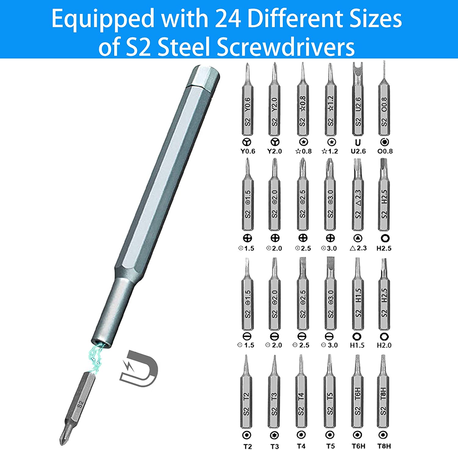 • 【Screwdriver specifications】 Screwdriver set tools equipped with 24 different sizes and shapes of high-quality screwdrivers, Including torx (T2, T3, T4, T5, T6, T8), crosshead (1.5, 2.0, 2.5, 3.0), flat head (1.5, 2.0, 2.5, 3.0), hexagon (H1.5, H2.0, H2.5), Y(0.6, 2.0), star (0.8, 1.2), slotted, triangular head, U-shaped point.