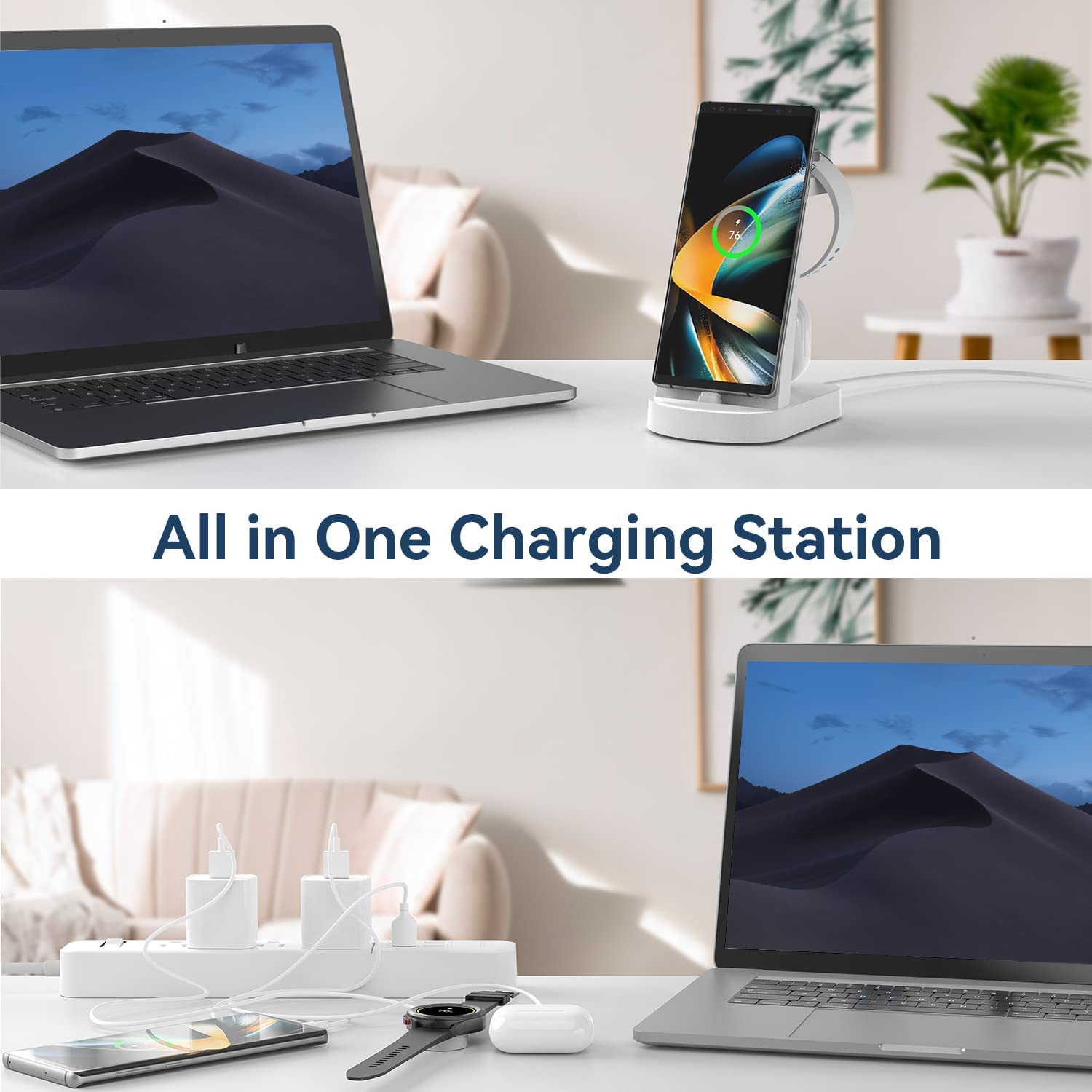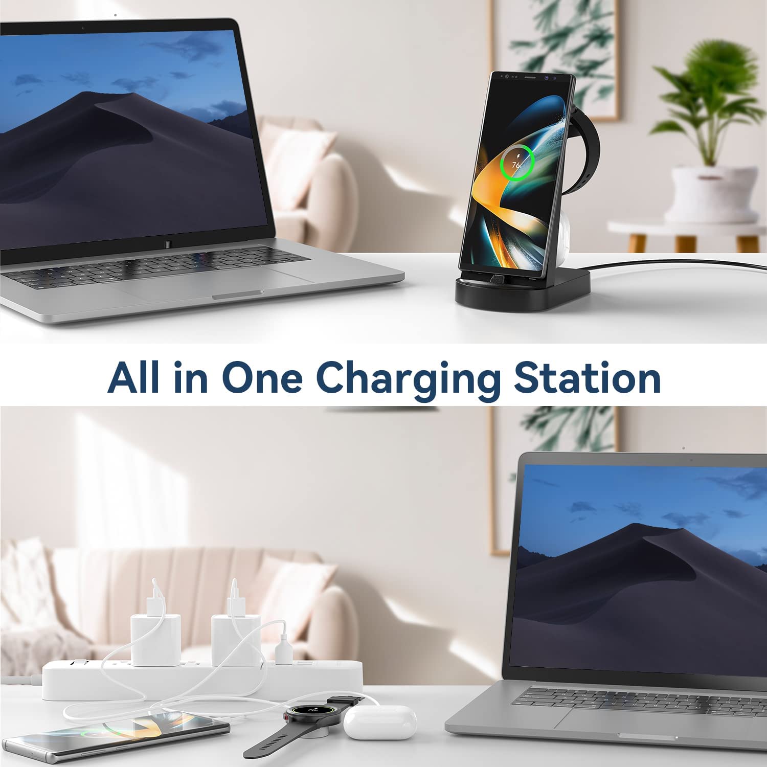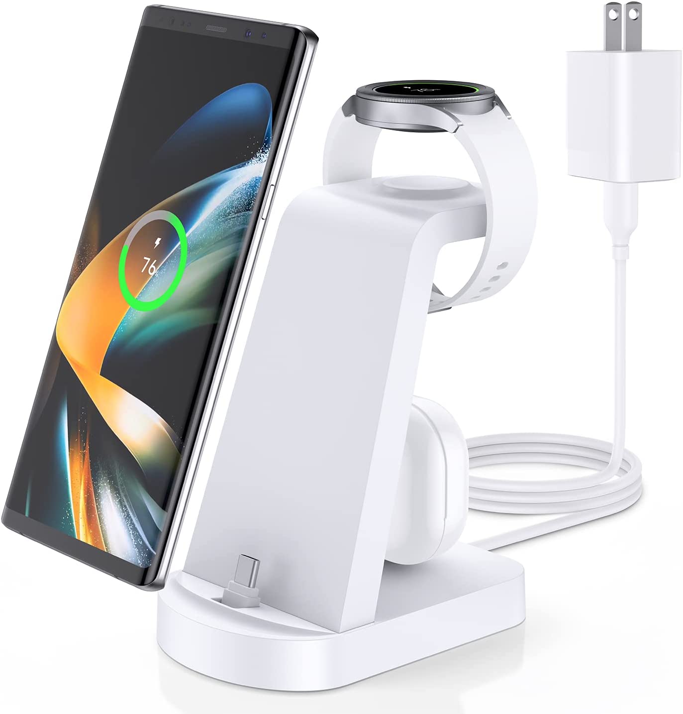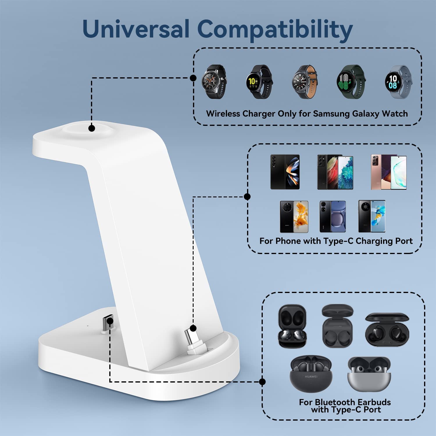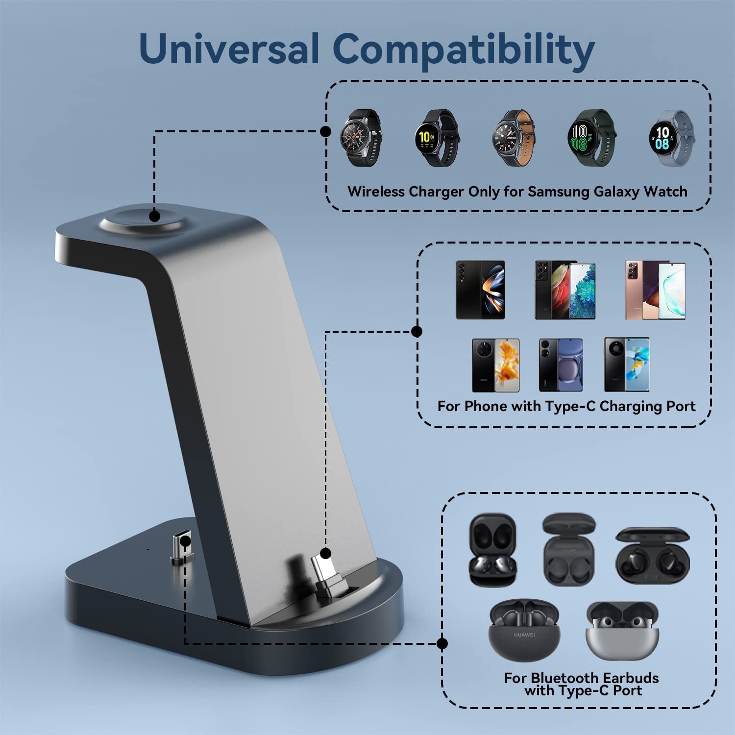 • 【Better Compatibility】This DUMTERR multifunctional charging station can adapt to more mobilephone models than general wireless chargers. Not only for Samsung Galaxy S22/21/20, but also for most Android phones. This charging station has a built-in TYPE C charger interface, which can charge any Android phone and Bluetooth headphone with Type-C charging port.The Wireless charging dock of charging station is only for Samsung Galaxy Watch.