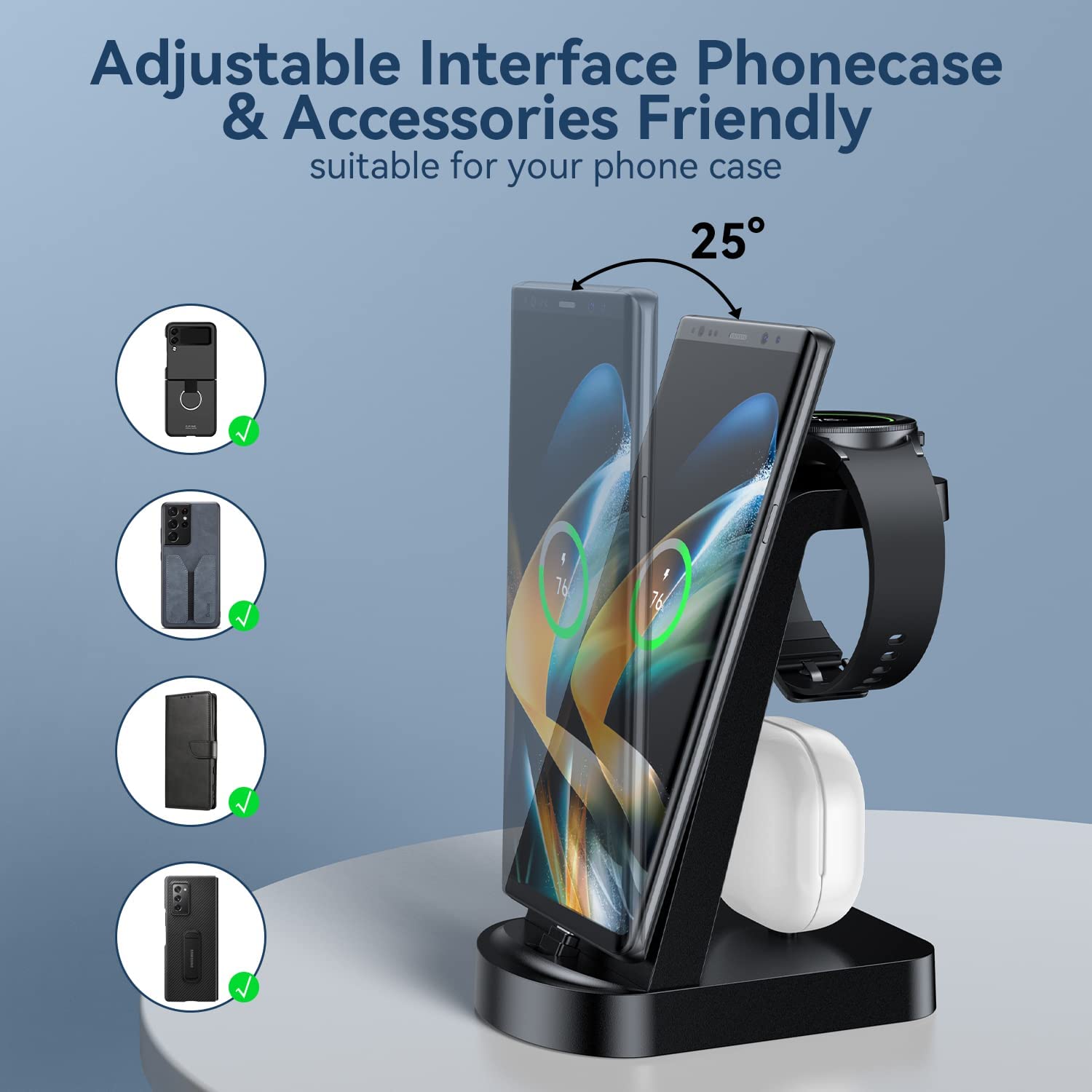 • 【Case Friendly】Our 3 in 1 charging station is specially designed for charging with a case. It is suitable for different thicknesse of mobile phone cases, and avoid the trouble of removing the phone case when charging.