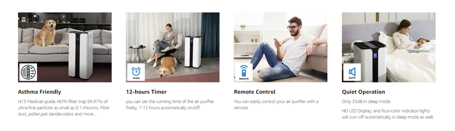 - <b>MEDICAL-GRADE FILTRATION:</b> Ture HEPA Air Purifier Large Room, H13 Ture HEPA filters filter 99.97% of fine particles (as small as 0.1 microns) as well as dust, pet dander; while also absorbing smoke, wildfire smoke, cooking odors, pet odors, and VOCs.