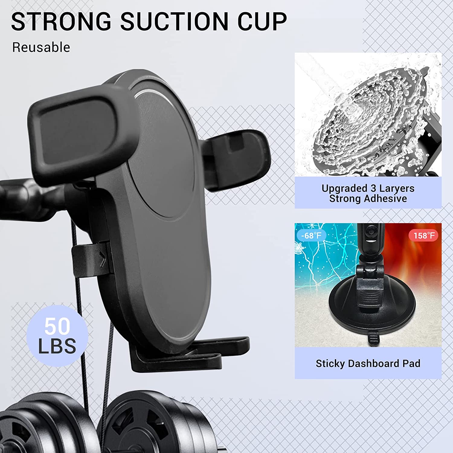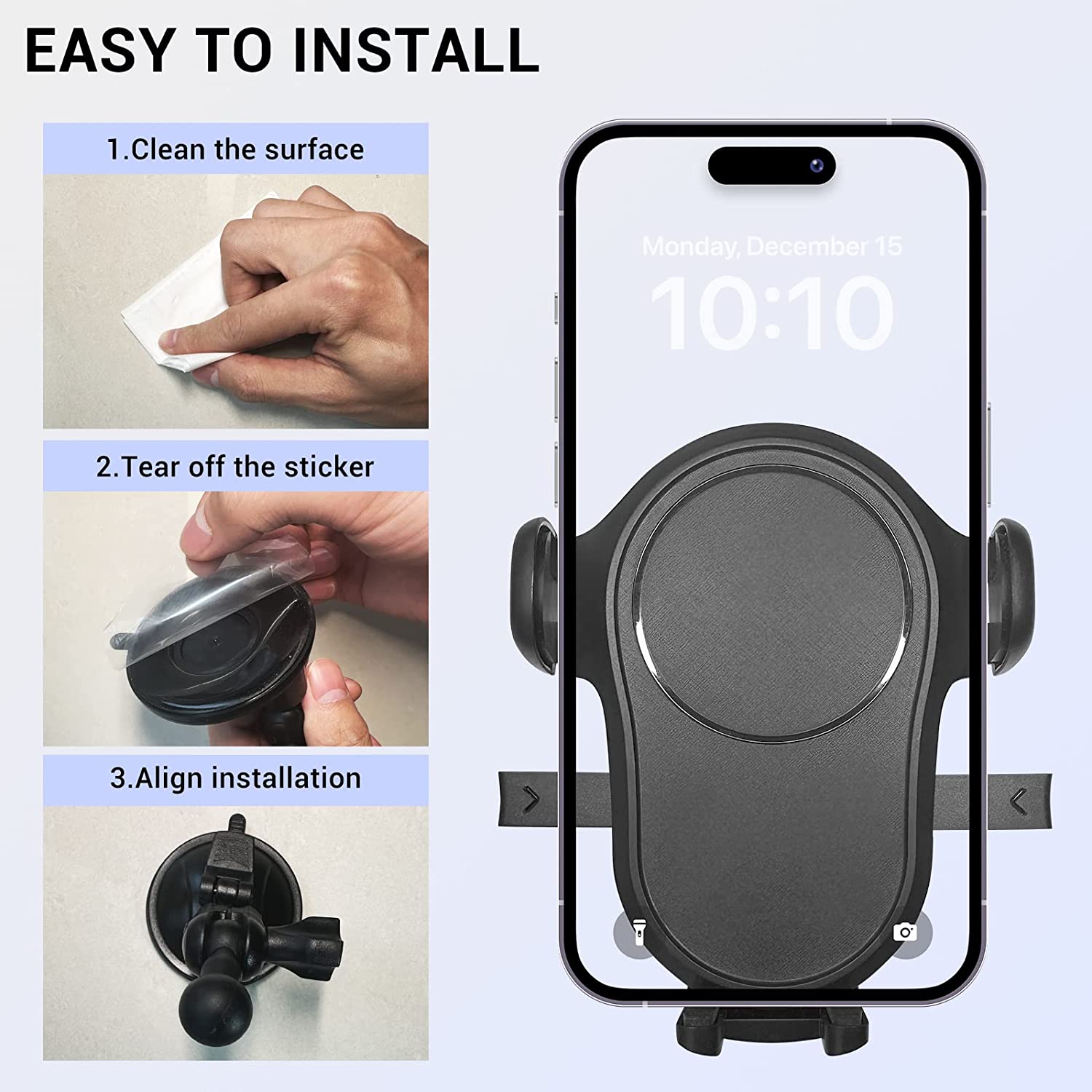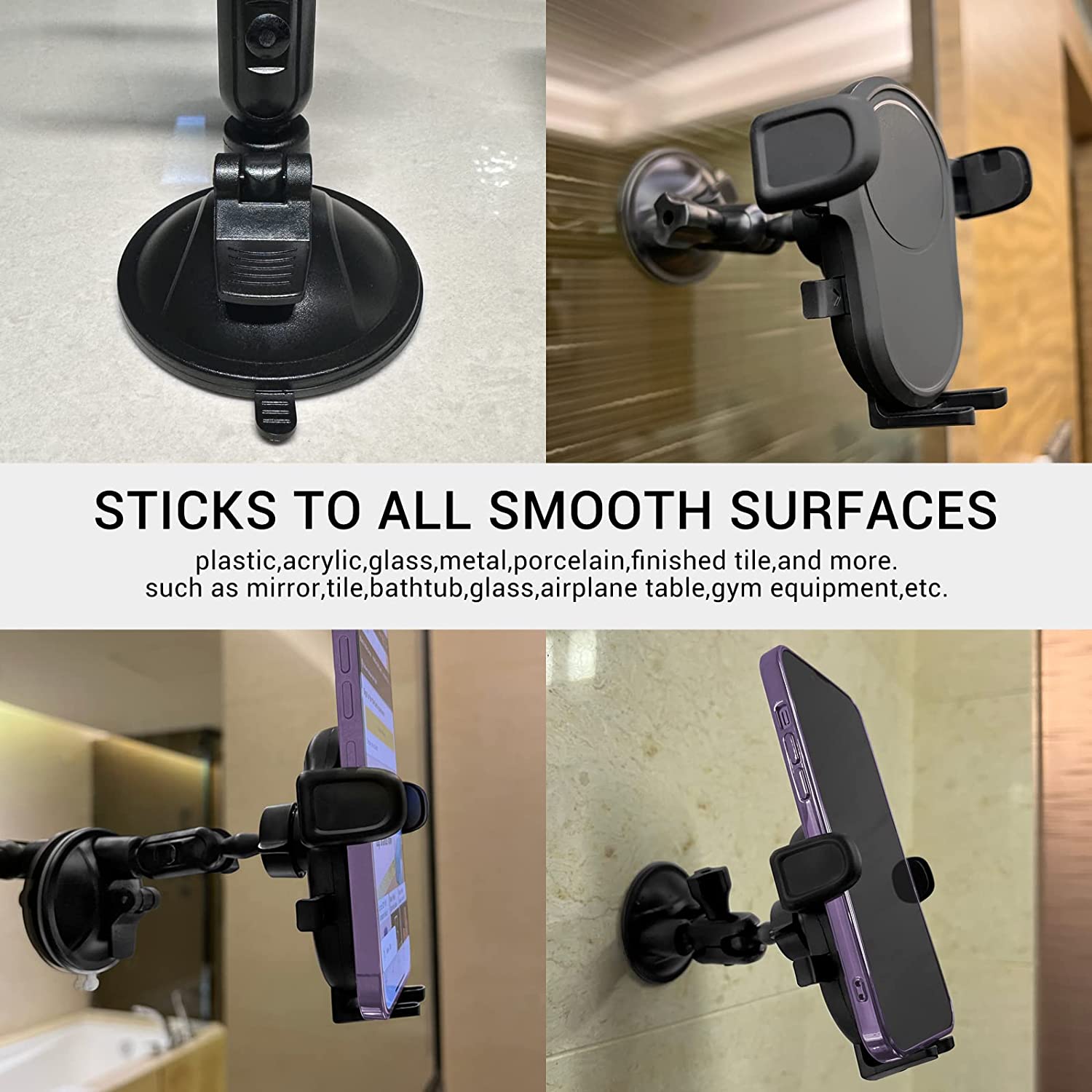 • 【Reliable & Secure】The powerful suction cup phone mount can mount your phone to any smooth wall or surface, such as mirror, tile, bathtub, glass, airplane table, gym equipment,Dashboard,Windshield etc.