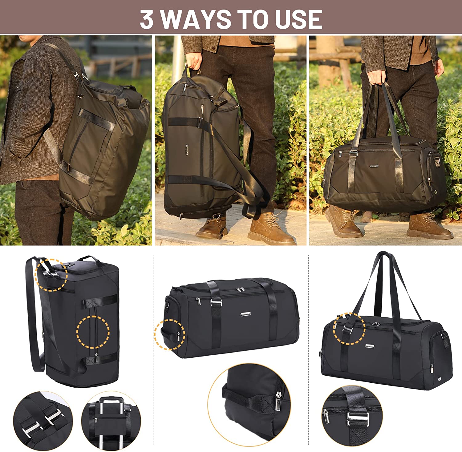 【Practical Design&Quality-Service】①Feel free to switch between travel duffle bags or backpacks.②Removable and adjustable shoulder strap meet your different needs for carrying,can make as backpack,handbag,shouler bag,cross-body bag. ③a zippered pocket on the back for storing your keys&trolley sleeve to fix the suitcase. ④ If you have any quality problems about our mens travel duffle bag,feel free to contact us,we will service you within 24hours.