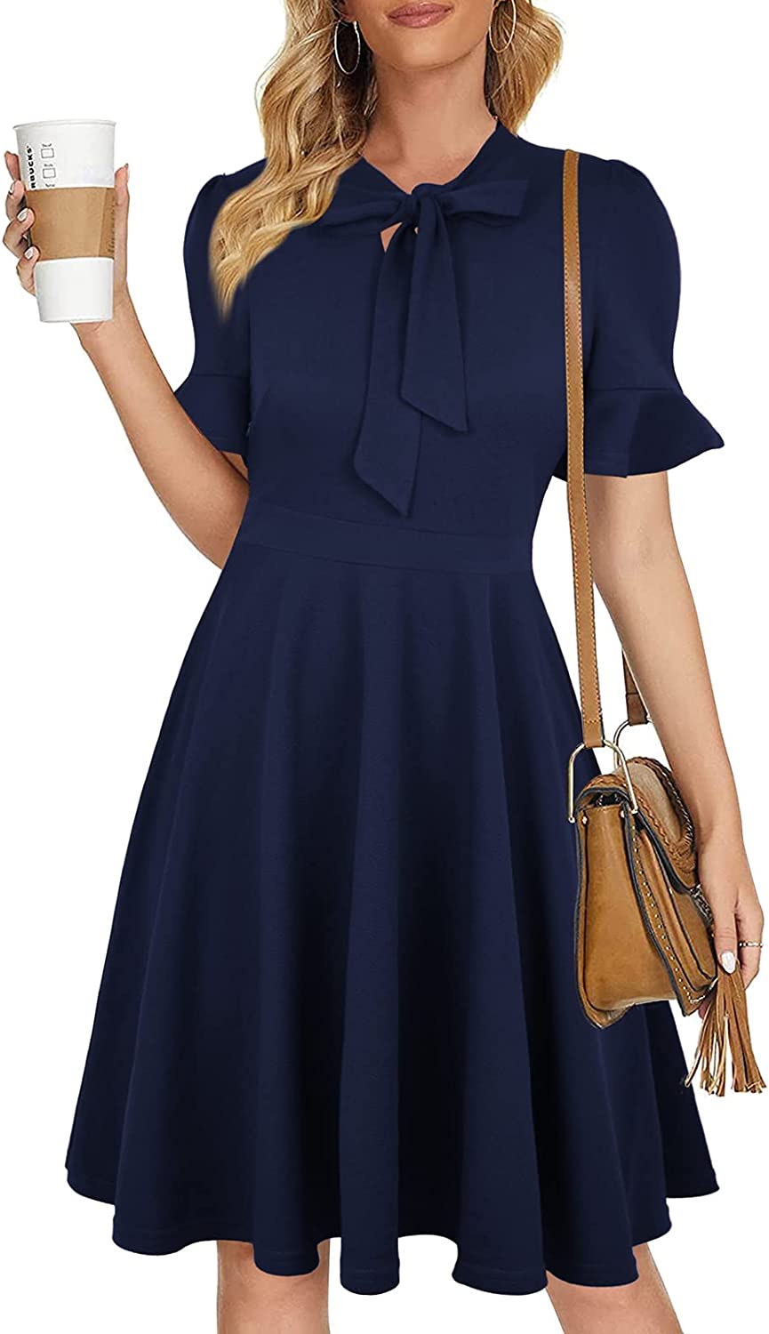 Mokayee Womens Summer Bow Tie Neck Semi Formal Ruffle Sleeve Church Office Wedding Guest Work Dresses