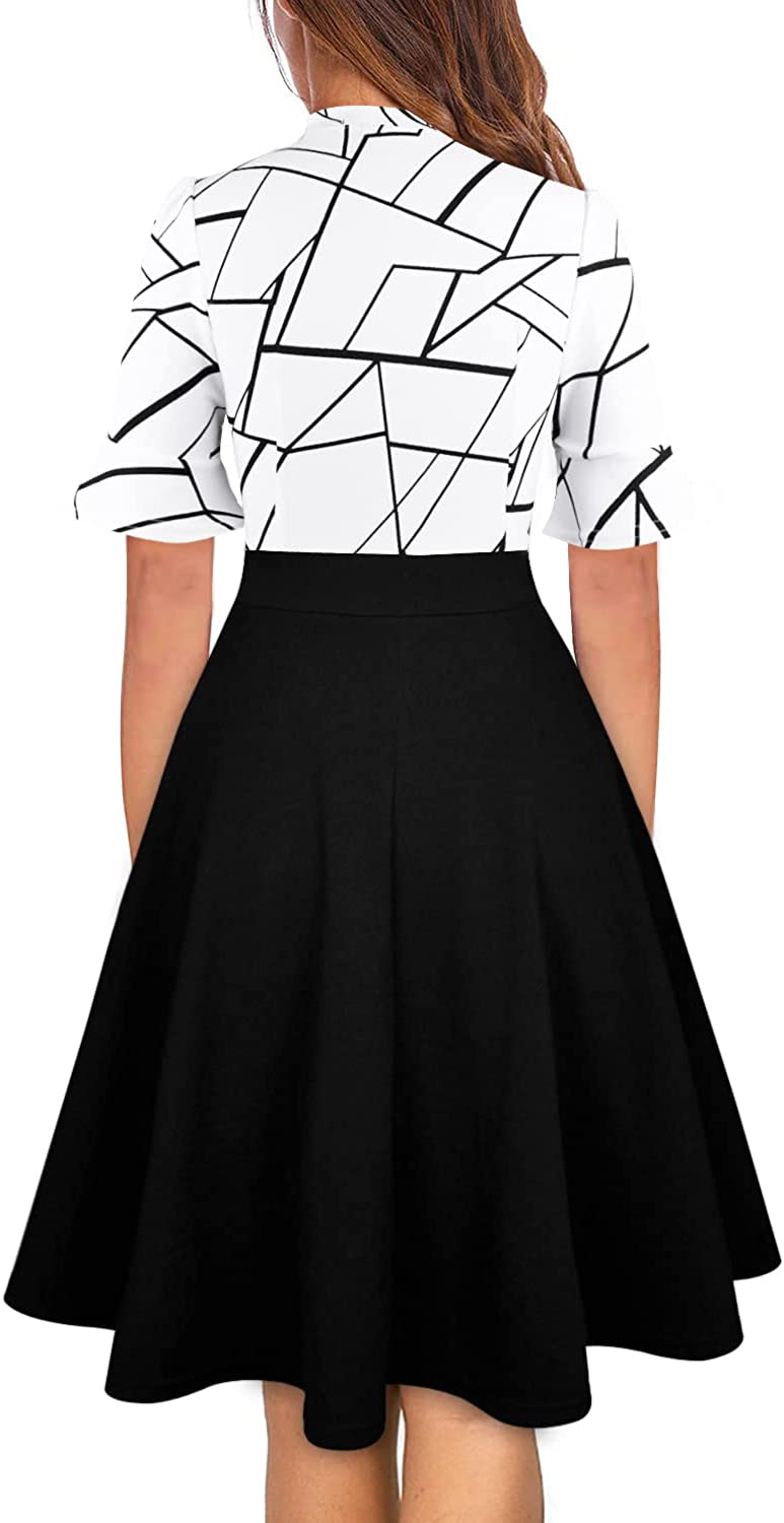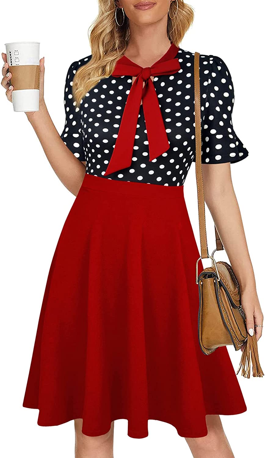 • Women's patchwork swing casual party cocktail dresses.Vintage style,eye-catching polka-dot stitching knee length flared skirt create some pizzazz and give the dress personality,very flattering on the body.