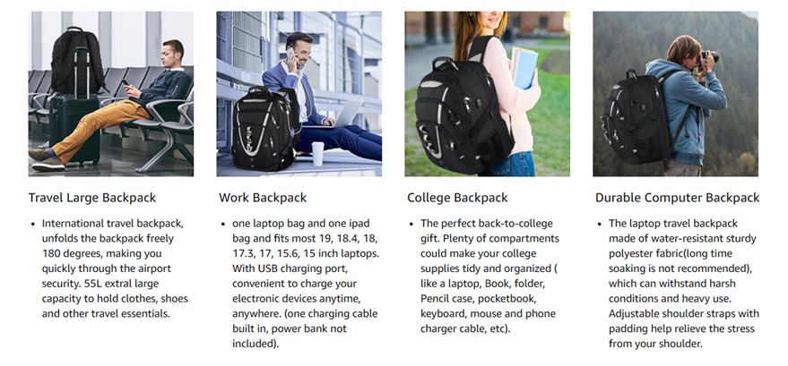 - LARGE TRAVEL & GAMING LAPTOP BACKPACK: Extra large business travel backpack size: 21.5*16.3*9.9 inch. Capacity: 55L. Multi compartments give excellent protection for laptop and tablet. Fits most 19,18.4,18,17.3,17 inch laptops and gaming laptop. The same style of backpack is divided into large and small size, 18.4 laptop backpack is increased capacity, more suitable for tall and strong people to carry. 17.3 laptop backpack capacity is moderate, please choose carefully according to your needs.