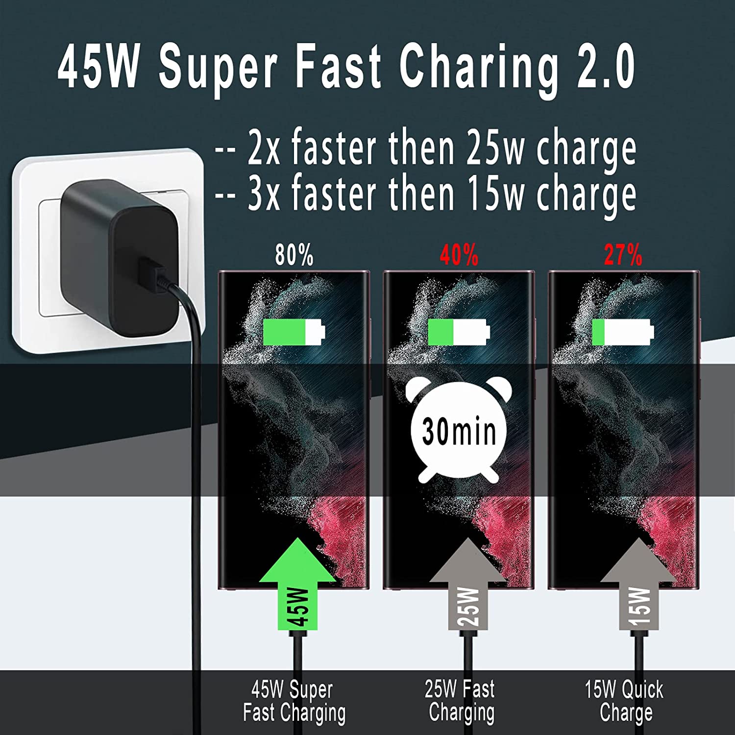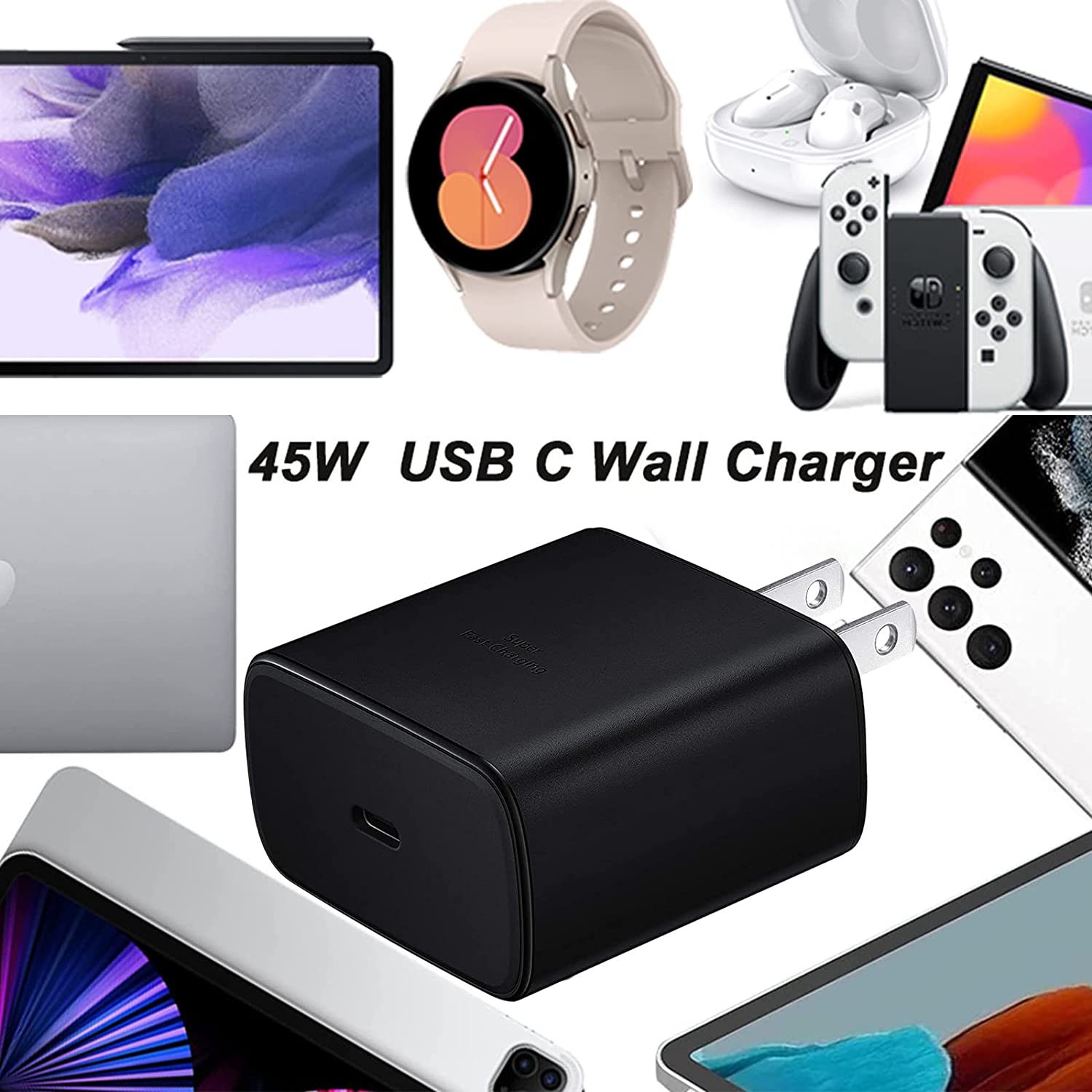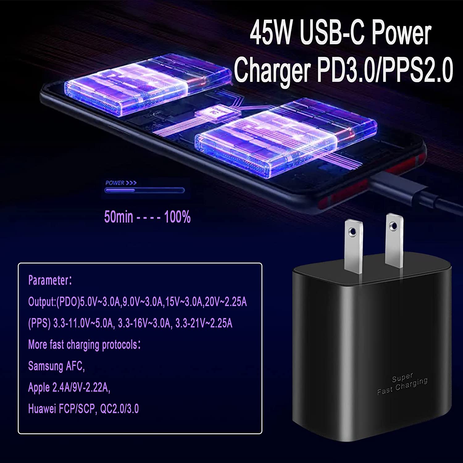 • ⚡ 45W Samsung Fast Charger : This 45 watt samsung type c fast charger contains PD3.0 and PPS2.O fast charge technology which apply to samsung devices. It is 3x faster than 15W adapter and 2x faster than 25W wall charger. The PPS allows the speed from 3.3V to 20V according to your device's charging condition with maximum power and safety.