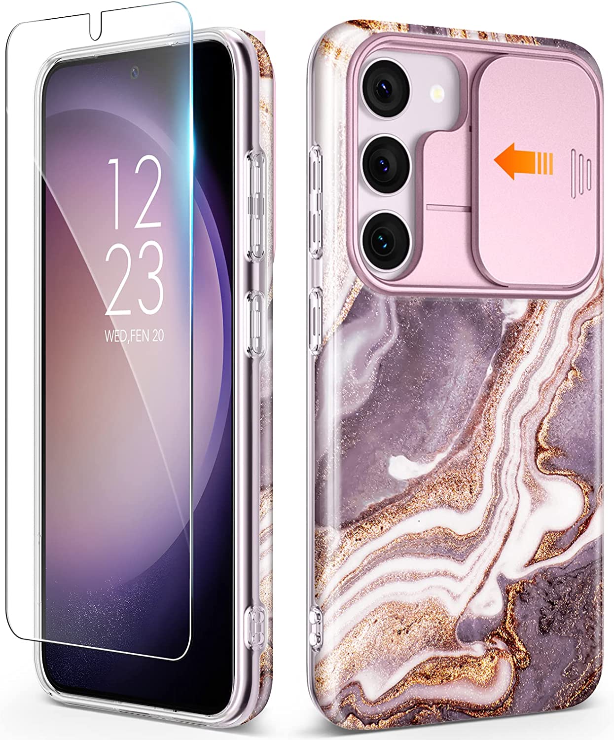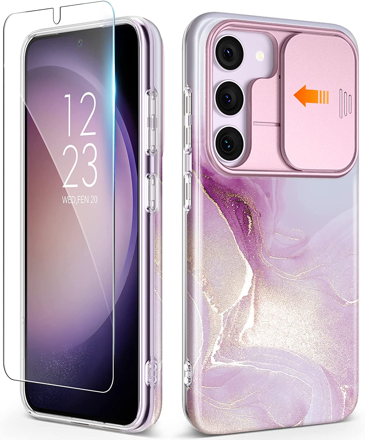 GVIEWIN Case Compatible with Samsung Galaxy S23 Plus with Slide Camera Cover + Screen Protector, [10FT Military Shockproof] Marble Slim Protective Phone Case, 5G 6.6-Inch 2023 (Dreamland River/Purple)