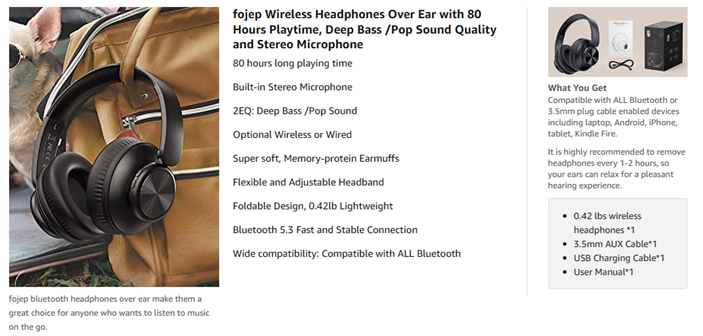 - 【80 Hours of Playtime】 V8 wireless headphones provide 80 Hours of playtime in Wireless mode, triple as much as other Wireless Bluetooth headphones.The over-ear headphones are compatible with all Bluetooth or 3.5mm plug cable enabled devices! fojep Bluetooth headset make them a great choice for anyone who wants to listen to music on the go.