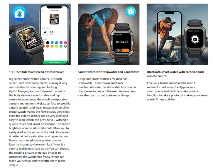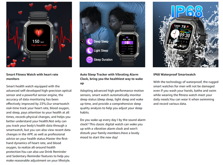 - Military smart watches for men - Special composite materials makes our running watch pass dozens of standard tests including temperature, low pressure altitude, dustproof, salt spray, fluid contamination, etc.Our military watches for men has passed drilling, crushing and hot steam scouring test which makes it suitable to be used in high temperature and high pressure environments. Rugged smart watch is going to be your ongoing reliable companion