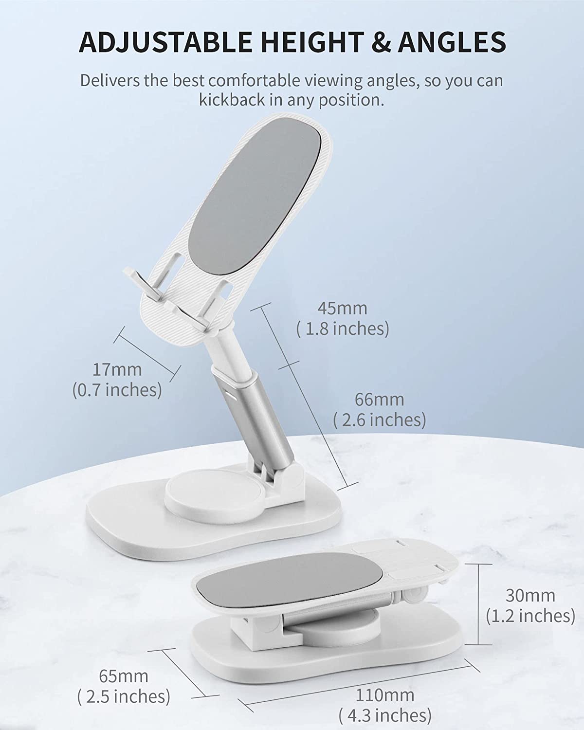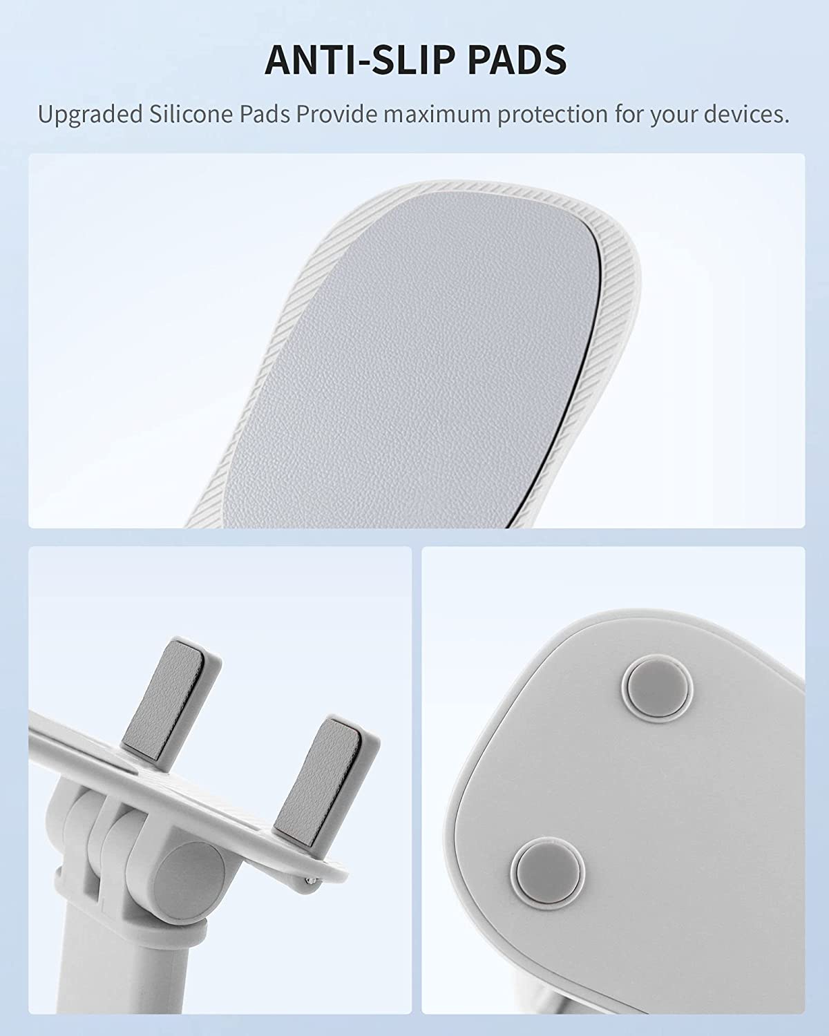 • ANTI-SLIP PADS - The padded front surface and the hook of this cell phone stand are fully covered by anti-skid silicone. Compared with other phone stands, the silicone pads were upgraded and became larger. Providing maximum protection for your device from any scratches and slides.