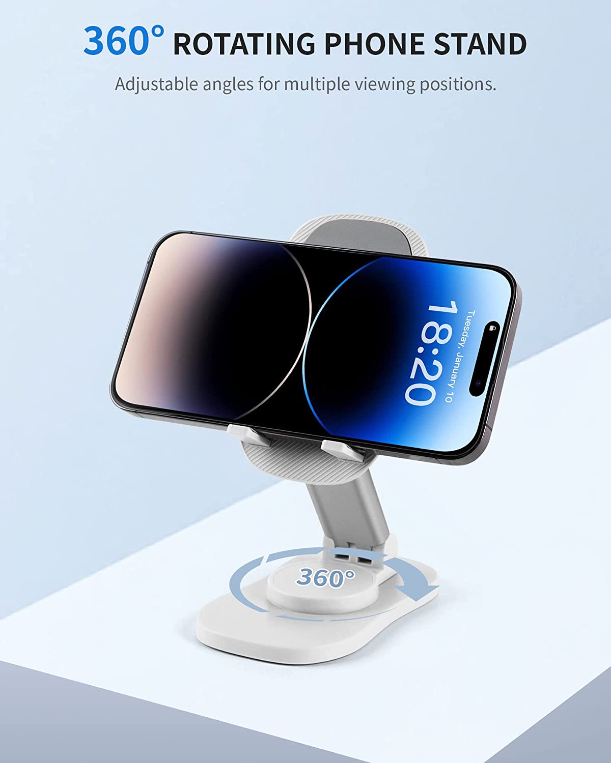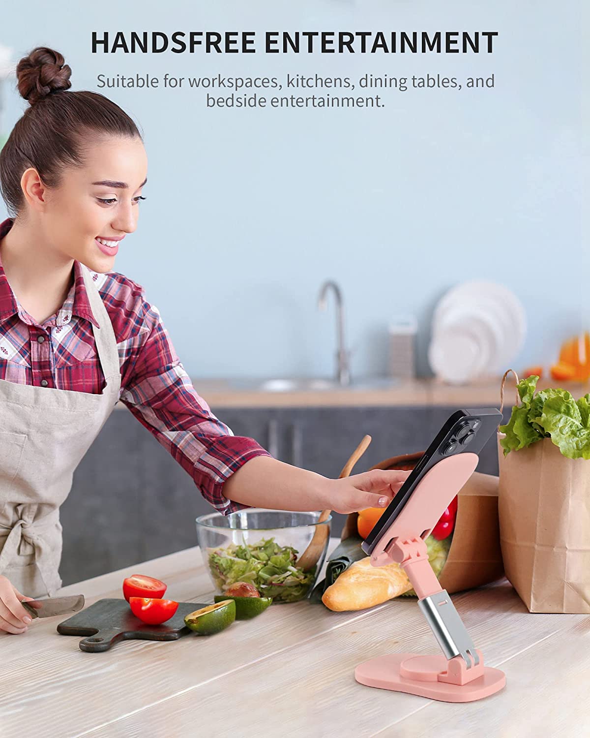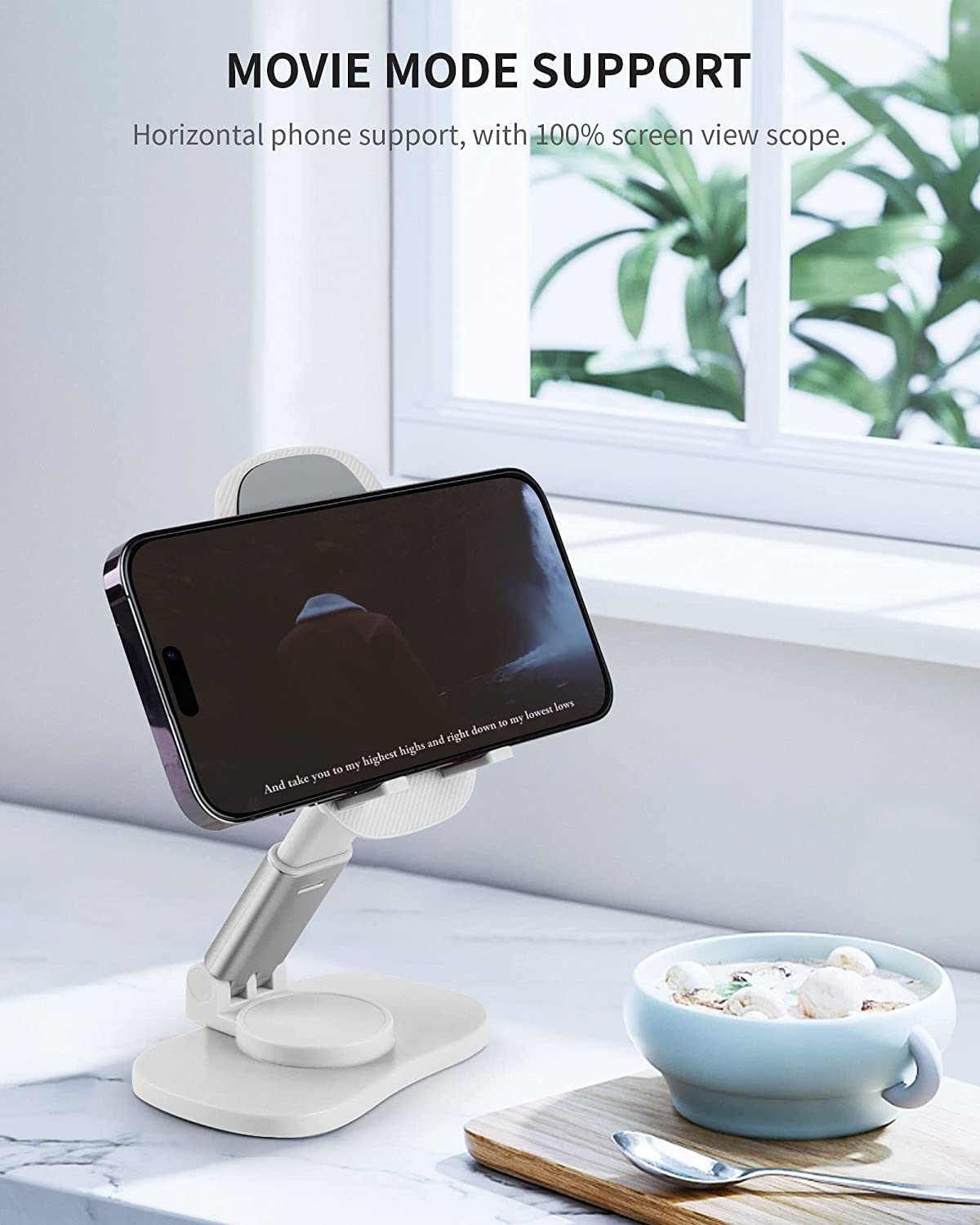 • HANDS-FREE ENTERTAINMENT - Having this desktop phone holder to prop up your phone and adjust it to the ideal position, you can free your hands while watching videos, making phone calls, using Facetime, and viewing recipes. Plays a good role in your office, kitchen, nightstand, or dining table.