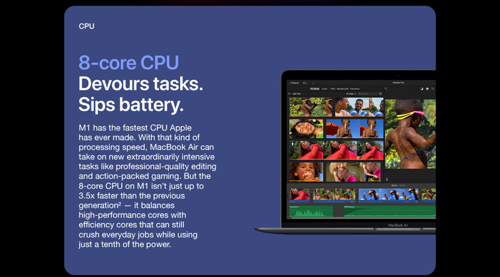 • Powerful Performance – Take on everything from professional-quality editing to action-packed gaming with ease. The Apple M1 chip with an 8-core CPU delivers up to 3.5x faster performance than the previous generation while using way less power.