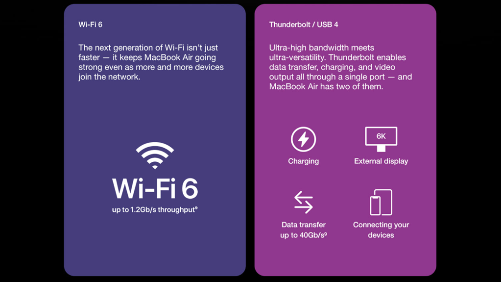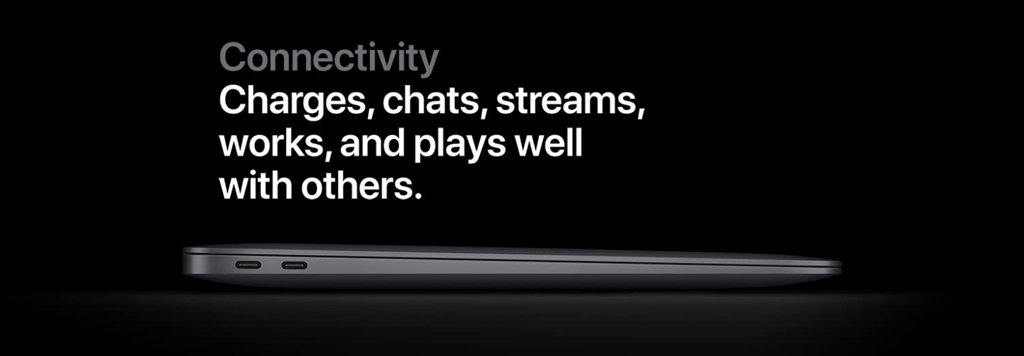 Charging and ExpansionTwo Thunderbolt / USB 4 ports with support for: Charging, DisplayPort, Thunderbolt 3 (up to 40 Gbps), USB 3.1 Gen 2 (up to 10 Gbps)