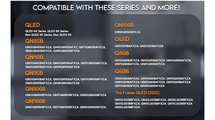 • Compatible with QN55QN85B, QN65QN85B, QN75QN85B, QN85QN85B, QN98QN85B, QN43QN90B, QN50QN90B, QN55QN90B, QN65QN90B, QN75QN90B, QN85QN90B, QN98QN90B, QN55QN95B, QN65QN95B, QN75QN95B, QN85QN95B, QN98QN95B, QN65QN800B, QN75QN800B, QN85QN800B, QN65QN900B, QN75QN900B, QN85QN900B, QN98QN100B