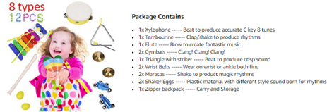 - Complete Musical Instruments for a Small Band - This kids musical instruments set provides drum, maracas, xylophone, Kazoo, Jingle stick, children could circle around and compose Jazz anytime. Specially the Kazoo, it is the most interesting and creative toy and instruments. Note to make sound like hum a tune, which will bring the vibration of the film inside. Search "Tsuko G" on youtube to learn how.