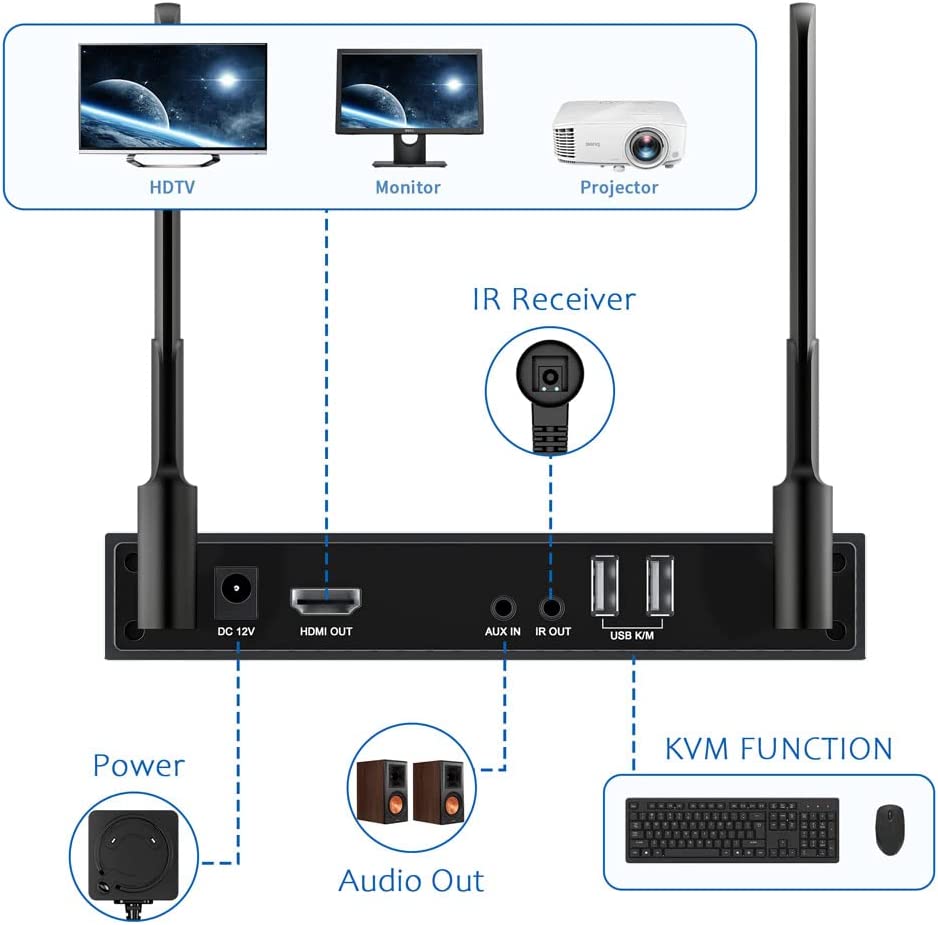 - 【IR Remote Control & KVM】 - This wireless hdmi extender is convinient for easily control the source device on the receiver between different room, different floors with any IR remote control or keyboard/mouse. It is the best choice for home theater, widely used in meeting rooms,Classrooms,Training rooms, living rooms, Roofs, Garages, Etc.