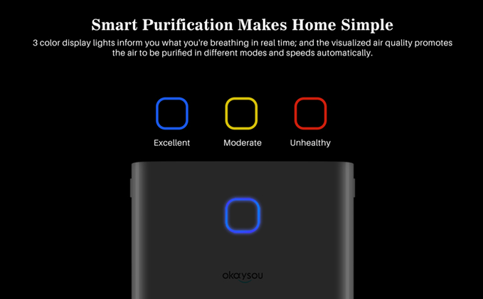 A beautiful square light panel on the front of the air purifier will change colors, based on the concentration of PM2.5.The tri-color light ring can be used as a high-speed reference for the indoor air quality, providing a clear picture of the quality of the air that you breathe.